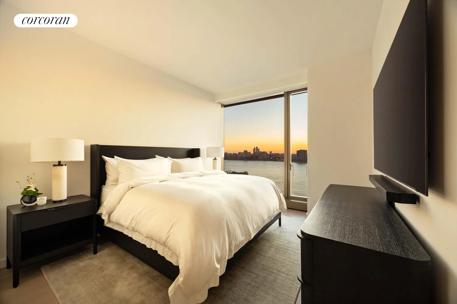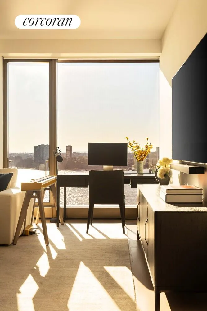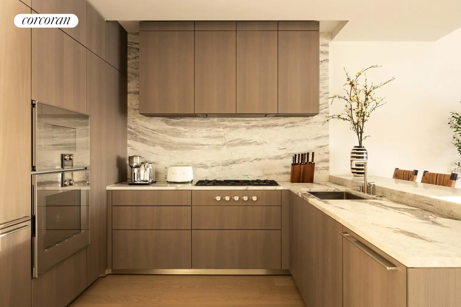 West 18B at One High Line is a beautifully proportioned one-bedroom, one-and-a-half-bathroom residence offering 1,042 square feet of refined living space. The residence opens into an elegant entry foyer that flows into an expansive great room framed by floor-to-ceiling windows, filling the home with natural light and showcasing stunning river and sunset vistas. The open kitchen is thoughtfully designed with custom Grey Larch cabinetry by Bulthaup, White Princess Quartzite countertops, a refined Gabellini Sheppard backsplash, a full suite of Gaggenau appliances, and stainless-steel fixtures by CEA Design.