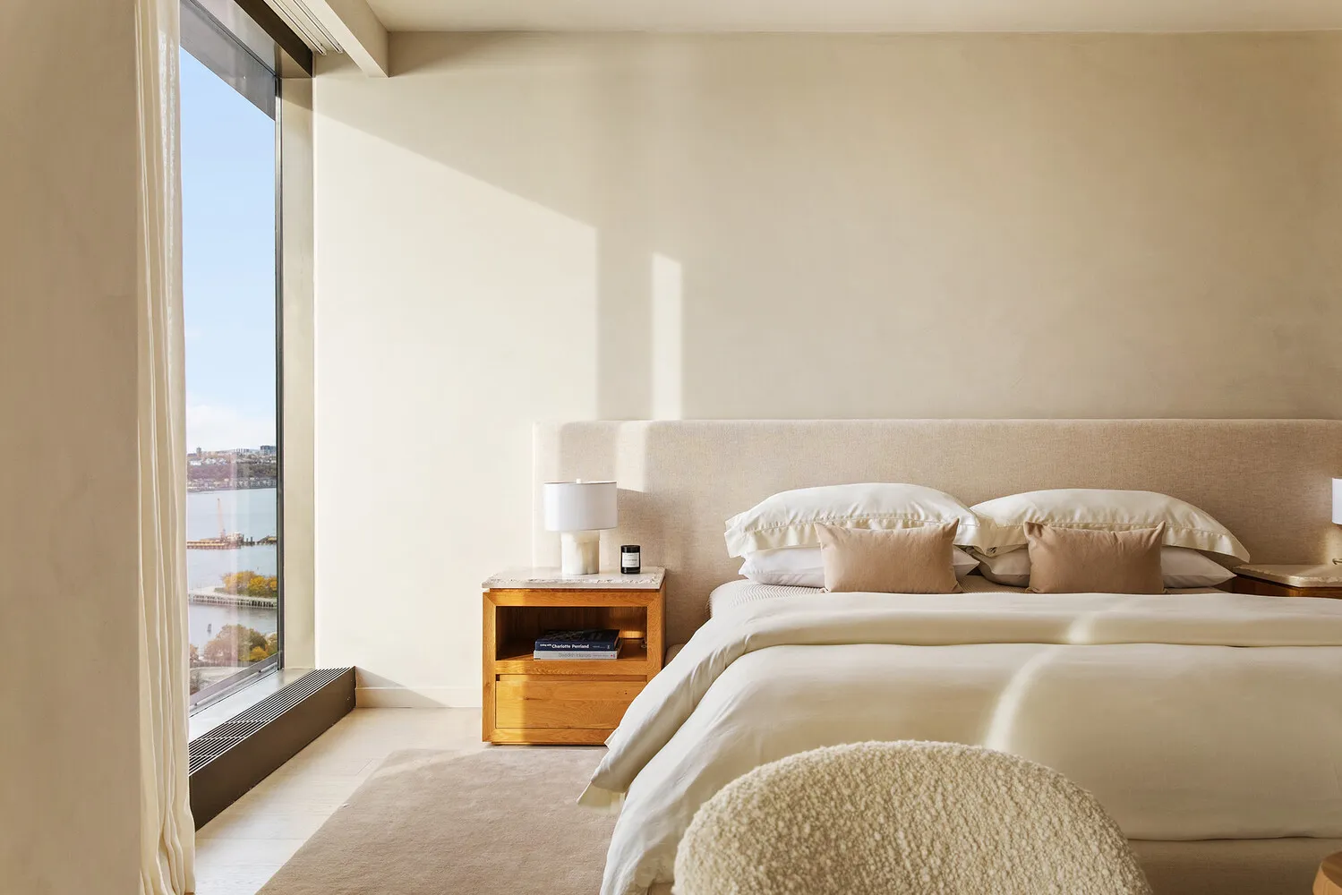 The primary suite occupies the western wing of the residence, where floor-to-ceiling windows frame steady daylight and river scenery. Custom built-in Ornare closet systems have been installed throughout the home. The five-fixture bathroom is finished in Taj Mahal Quartzite and features radiant heated floors, a custom Lumix double vanity, an illuminated medicine cabinet, and a Kaldewei soaking tub. Each secondary bedroom maintains a sense of luxurious autonomy with ensuite baths clad in Woodgrain Silver Marble and fitted with custom oak vanities, premium fixtures, and radiant heat. A dramatic powder room is lined in vein-cut Grigio Onyx. Extensive closet space, a laundry room with high-end washer and dryer, and a comprehensive home automation system by Kraus Hi-Tech complete the home.