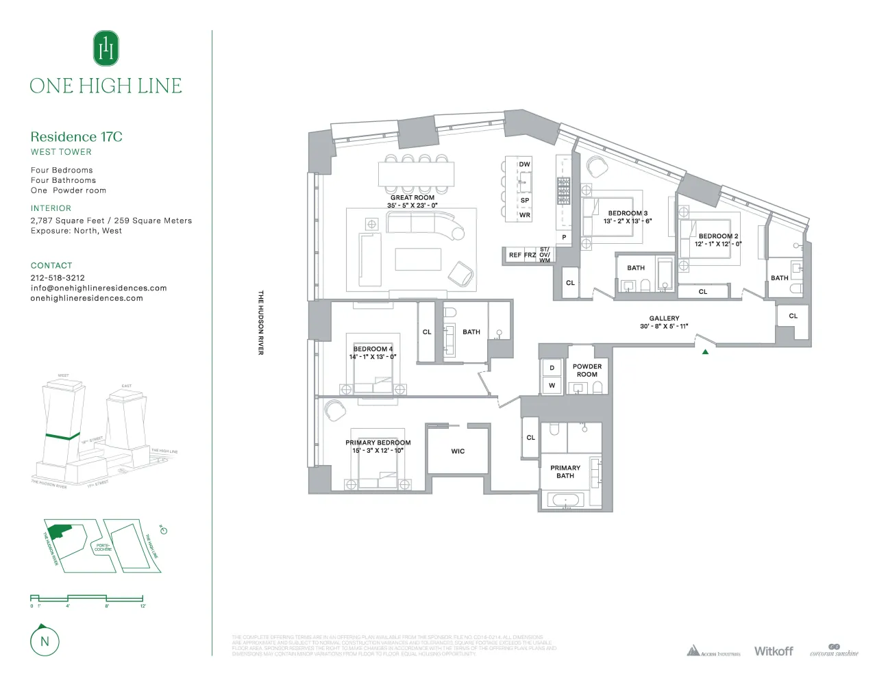 West 17C at One High Line is a 2,787 SF four-bedroom and four-and-a-half-bathroom corner residence curated by Gabellini Sheppard Associates with north and west exposures. This remarkable home features northern and western exposure overlooking the Hudson River and receiving an abundance of natural light throughout the day. Residence 14C home boasts a generous great room and open kitchen custom designed by Bulthaup, complete with White Princess Quartzite countertops and backsplash, a robust Gaggenau appliance package and stainless-steel fixtures by CEA Design.
