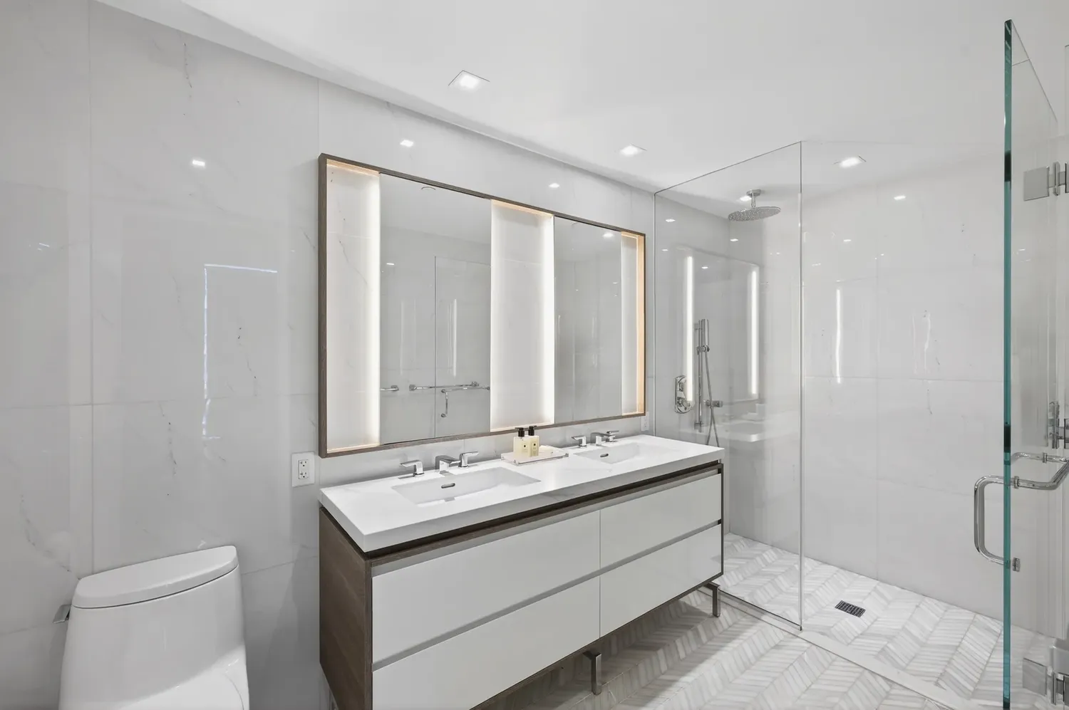 The primary suite fits a king bed with a large walk-in closet and en-suite bath, while the second bedroom fits a queen and is near the second full bath. Both bathrooms feature marble floors and premium Toto finishes.
