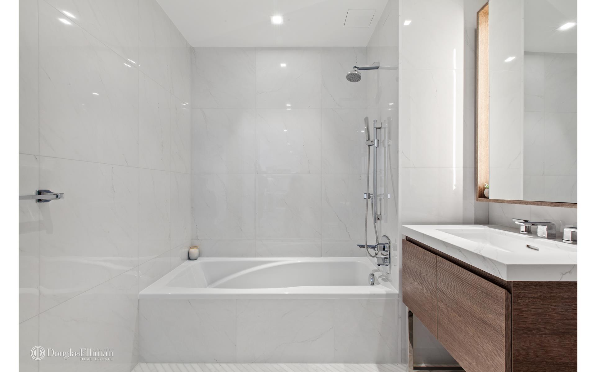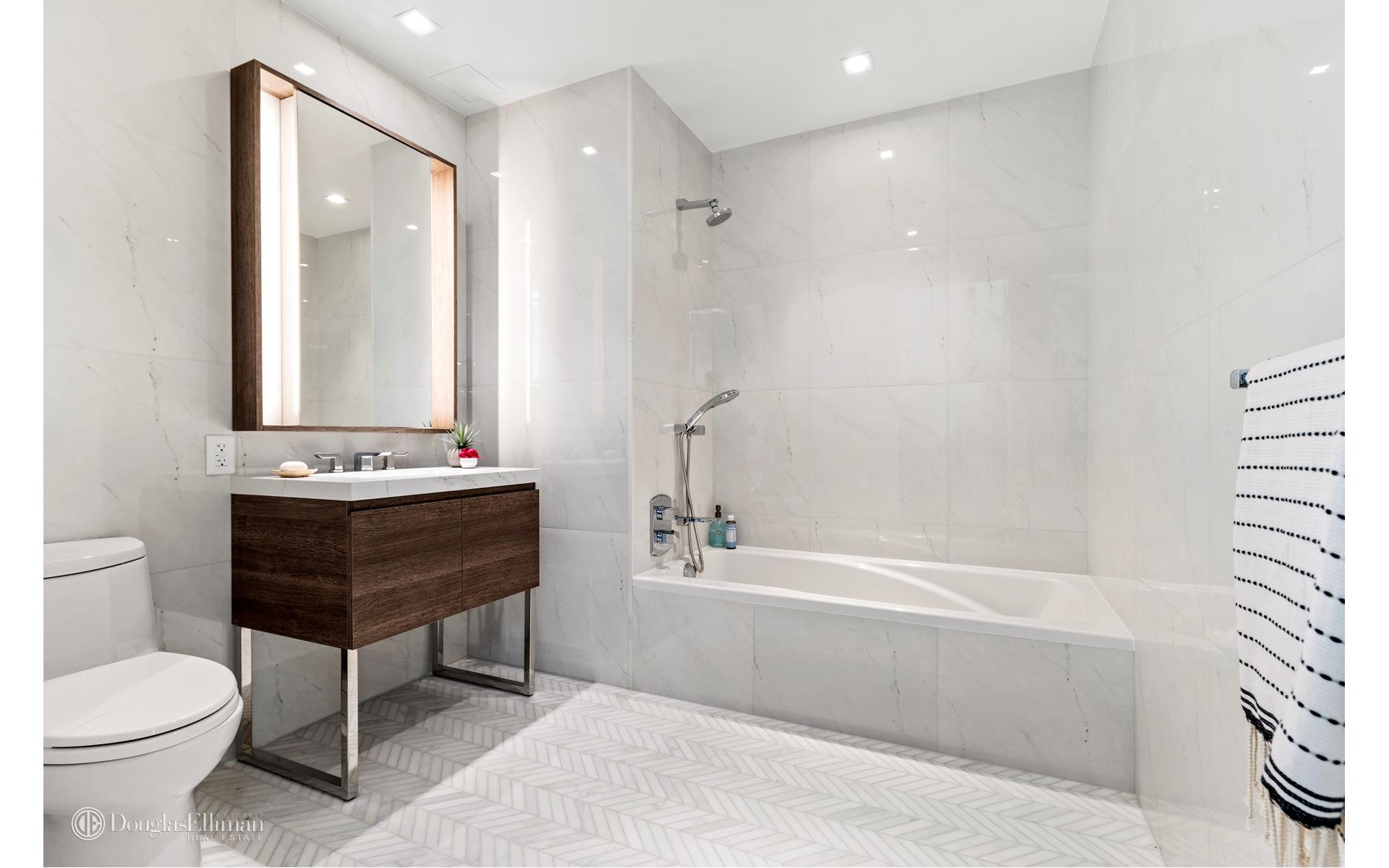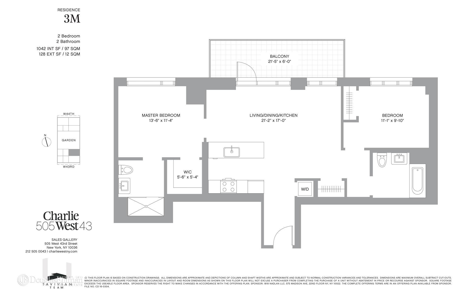 Residence 3M is a perfect split 2-bedroom, 2-bathroom home with a large private balcony (approx. 130 SF) overlooking the building's beautiful garden. Spanning 1,042 SF, the home's interior features a large, open living area and modern kitchen with integrated appliances, ample counter space, and a large peninsula. The private master bedroom includes an exquisite en-suite bath with heated herringbone floors as well as a walk in closet ? both with excellent proportions! For further convenience, the residence also provides an in-unit washer-dryer.