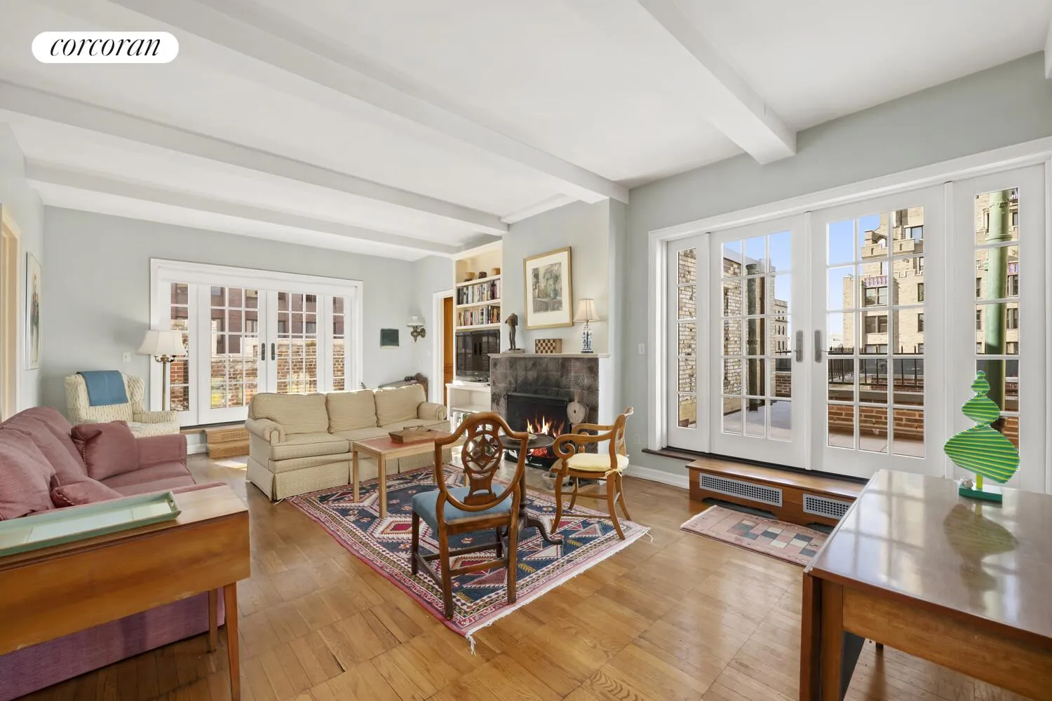 Featuring a wide wrap terrace with large and rarely found south, east, and west facing areas, this distinctive 2BR, 2BA Carnegie Hill prewar penthouse apartment with wood-burning fireplace exemplifies home. The sense of indoor and outdoor space is seamless. Sunlight fills every room. The tri-sided terrace not only includes a south facing direction coveted for home kitchen gardens, but each side can also be adapted as an additional "outdoor room" to accommodate personalized functions and interesting views in all seasons from interior rooms. George Pelham, the building architect, specified terrace details which called for crenellated brick parapet walls, adding repeating design articulation that creates elegance and period interest. Three sets of double French doors with sidelights invite easy indoor and outdoor movement as well as establishing historical warmth.