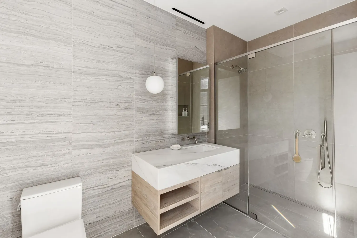 Bathroom Walls Wrapped in Pelle Grigio Vein Marble Tiles