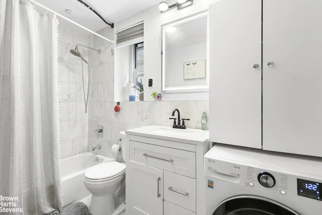 The renovated windowed bathroom features clean, modern finishes and the convenience of an in-unit washer/dryer, a true standout for this price point.