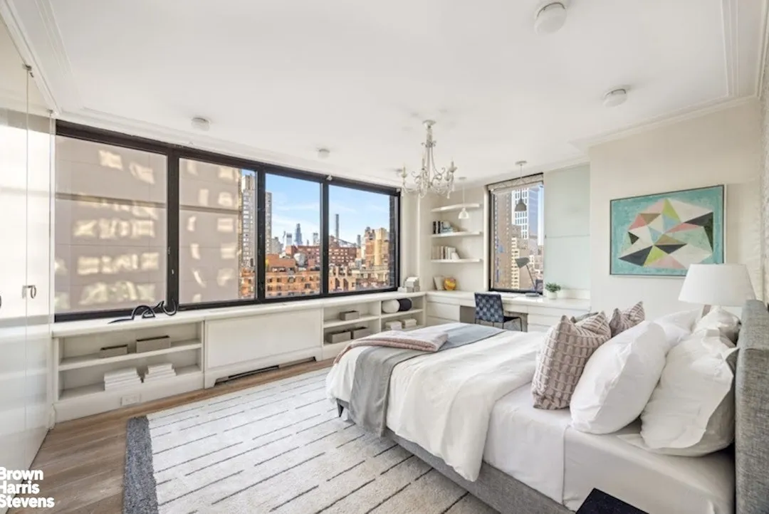 At the top of the stairs, you are once again greeted by sunlight from floor to ceiling windows, looking north to see Carl Schurz Park and east to see a sliver of the East River. This room makes an excellent den or media room. The primary bedroom suite feels unbelievably luxurious in size, with a dressing room, enormous walk-in closets, and a primary bathroom with a wall of windows facing south, double vanities, walk-in shower and yet another home office! The primary also has a balcony and curved windows facing south and east allowing the room to bask in sun.