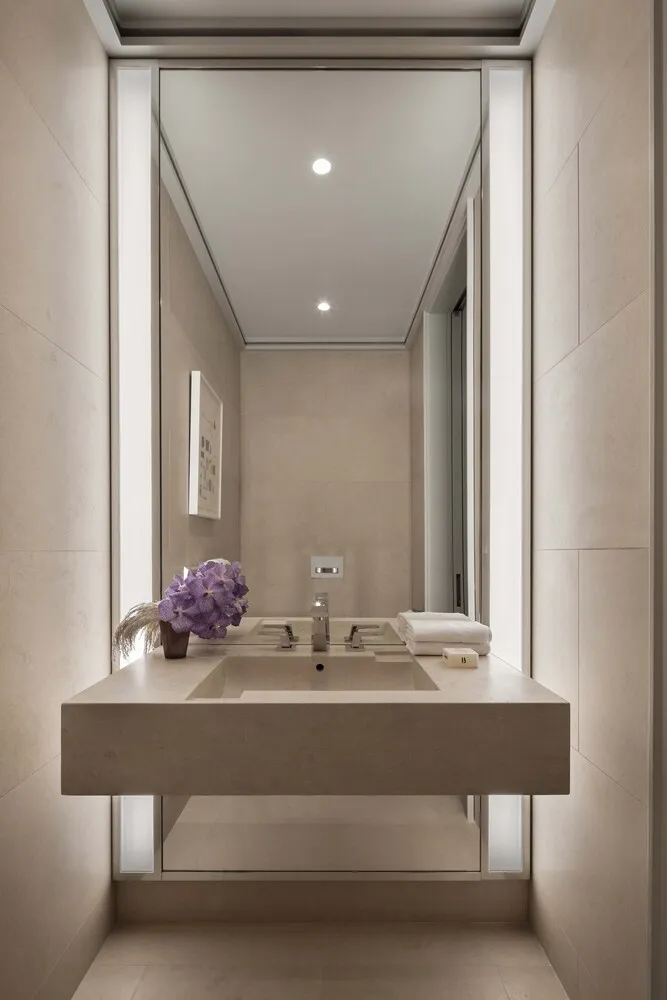 The primary suite offers east-facing views; a generous walk-in closet; and spa-like ensuite bathroom that blends tradition and originality. Elegantly appointed in polished Noir St. Laurent marble, high-honed Verona limestone, and polished Persian golden travertine with polished nickel Dornbracht fixtures throughout, the primary bathroom features two separate custom carved vanities with custom Thierry Despont-designed polished nickel automated mirrors, a cast iron Lefroy Brooks soaking tub, freestanding shower, radiant heated floors, private water closet with commode and bidet, and a large linen closet. A gracious secondary bedroom enjoys east-facing views and offers an en suite bathroom clad in high-honed Verona limestone with polished nickel Dornbracht fixtures. Completing the residence are a beautifully appointed powder room and a discreet utility closet with side-by-side washer and vented dryer. No detail has been overlooked, from the custom interior lighting design by Thierry Despont in collaboration with Schwinghammer, to the motorized Lutron solar shades throughout with additional blackout shades in each bedroom, to the supply of humidified and filtered fresh air throughout the home.