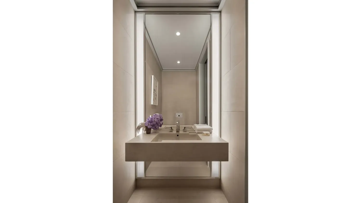 The primary suite offers east-facing views; a generous walk-in closet; and a spacious en suite bath with radiant heated floors. Elegantly appointed in polished Noir St. Laurent marble, high-honed Verona limestone, and polished Persian golden travertine with polished nickel Dornbracht fixtures throughout, the primary bathroom features two separate custom carved vanities, a cast iron Lefroy Brooks soaking tub, freestanding shower, private water closet with commode and bidet, and a large linen closet. A gracious secondary bedroom enjoys east-facing views and offers an en suite bathroom clad in high-honed Verona limestone with polished nickel Dornbracht fixtures. Completing the residence are a beautifully appointed powder room and a discreet utility closet with side-by-side washer and vented dryer. No detail has been overlooked, from the custom interior lighting design by Thierry Despont in collaboration with Schwinghammer, to the motorized Lutron solar shades throughout with additional blackout shades in each bedroom, to the supply of humidified and filtered fresh air throughout the home.
