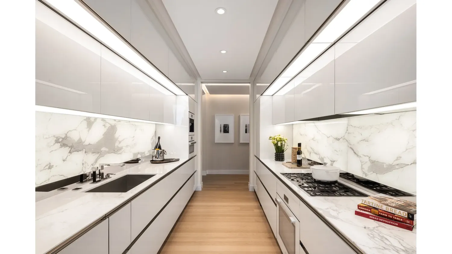 From the entry gallery, the generous corner living room is lined with floor-to-ceiling windows that artfully frame south- and east-facing views. A proper dining room with east-facing exposures is framed by multiple pocket doors that adjoin the living space at one end and the kitchen to the other for optimal flexibility and seamless entertaining. The windowed custom kitchen by Thierry Despont for Molteni features polished statuary marble countertops and a back-lit statuary backsplash that complement back-painted glass cabinetry with polished nickel detailing and Dornbracht fixtures. The extensive suite of appliances by Miele and Sub-Zero includes a fully integrated refrigerator and freezer, five-burner cooktop with fully vented hood, integrated dishwasher, wall oven, speed oven, under-counter wine refrigerator, and integrated coffee maker.