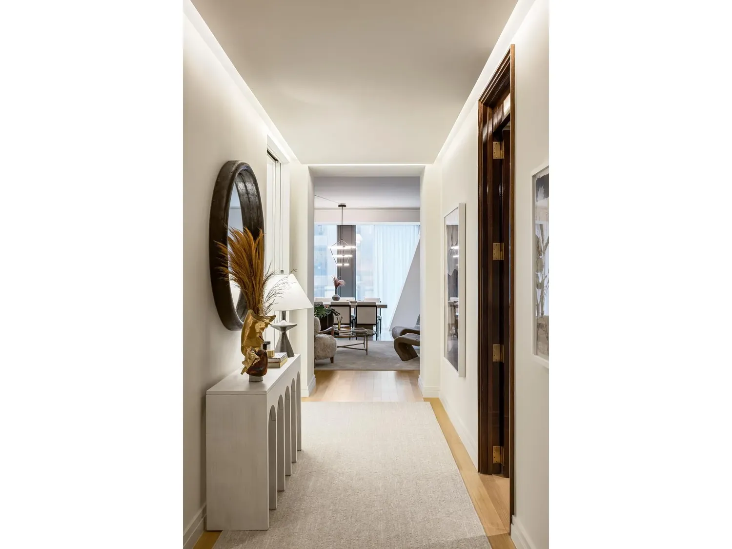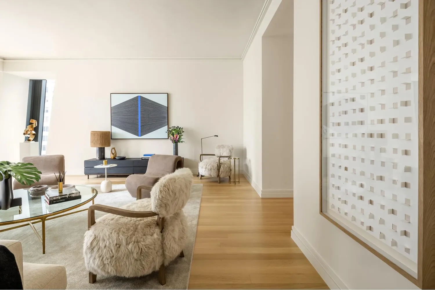 Combining superb sophistication and craftsmanship with the intimate feeling of home, Residence 34C at 53 West 53 comprises 2,506 square feet, offering three bedrooms, three-and-a-half bathrooms, and north-, south-, and west-facing exposures. Gracious proportions and ceilings ranging up to approximately 10'9" set the awe-inspiring stage for world-renowned designer, Thierry Despont, to craft singular spaces in the sky with many custom elements typically reserved for primarily commissioned homes. The rich yet soft palette of museum-quality finishes imbues each space with boldness and elegance.