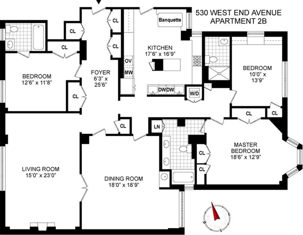 Situated in the heart of the Upper West Side, pre-war elegance seamlessly melds with modern finish. This elegant classic 3 bedroom, 3 bathroom home offers space, layout and finish. This residence boasts over 11 foot ceilings, with beautiful Eastern and Western exposures providing superb light throughout the day. This Classic 6 provides a great comfortable layout with a split bedroom layout for privacy. One arrives into a dramatic gallery entrance which incorporates deep storage flanking one wall upon entry. The deep great room features three superb oversized windows facing West. This well-proportioned living room is all complimented by old era beamed ceilings, and a decorative fireplace. There are classic art deco French doors that lead one into the formal dining room from the living room. One finds that there is a hidden bar in the dining room, and a beautiful and rare lead paned glass window overlooking the East side of the property onto an English garden. The chef level eat-in kitchen is outfitted with top-of-line appliances, including Sub-zero refrigeration, Miele cook top range, dual ovens, and two dishwashers and two sinks. The windowed kitchen is furnished with a cool sleek dark granite countertops that are accented by custom cabinetry providing great storage. The master bedroom which comfortably houses a king-size bed offers plenty of storage all complimented with a classic and rare bay window facing East onto the garden. The windowed en-suite master bathroom features renovated dual sink and Anne Sacks Tile, deep soaking tub, and radiant heat floors. The oversized second and third bedroom all include en-suite private windowed bathrooms and are renovated, complimented with great natural light. This home also features its own washer/dryer. The Sexton at 530 West End Avenue was erected in 1912 and converted to condominiums in 1984. Designed by Mulliken & Moeller, The Sexton reaches 13 stories and has 43 residences. The building features a 24-hour doorman, live-in superintendent, laundry room, and bike storage. Conveniently located on a Prime Upper West Side block, this residence is in close proximity to transit, shopping, dining and the arts.