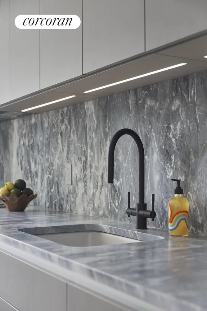 Residence 606 is a spacious 947sf split two-bedroom, two-and-a-half-bath home with north-facing city views. The open-concept kitchen is outfitted with marble countertops and backsplashes, custom cabinetry offering ample storage, and premium appliances by Miele and Bosch.