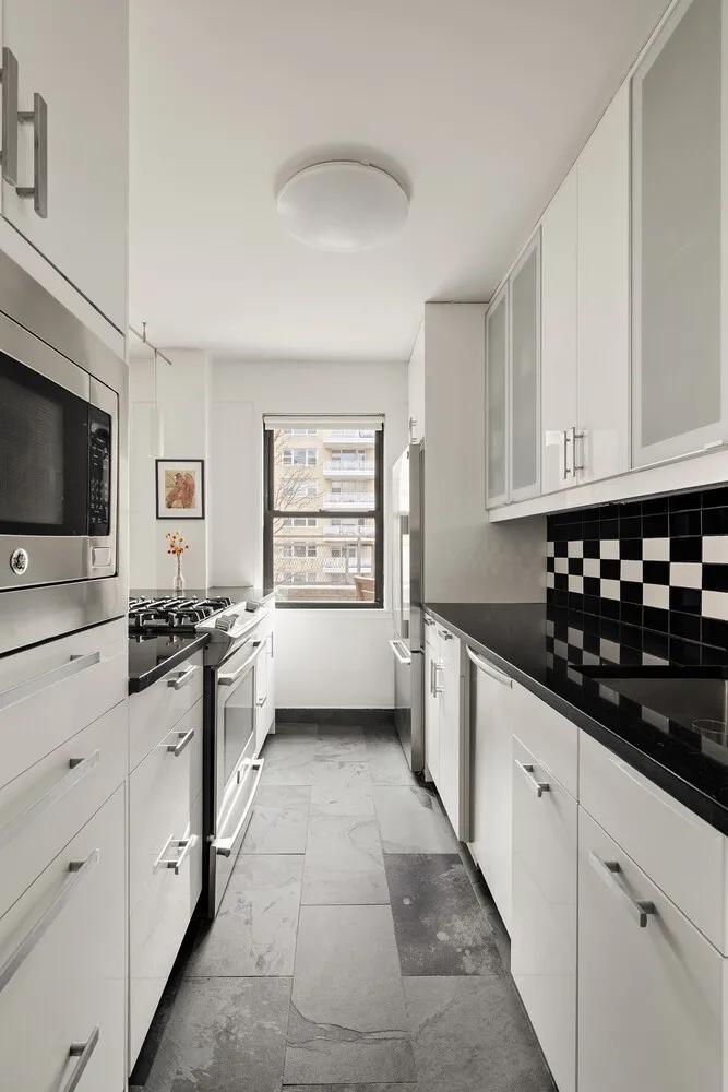 Flooded with natural southern light, the expansive living and dining area is the centerpiece of the home, offering an ideal layout for both everyday living and entertaining. A door off the living space leads to a private terrace, perfect for morning coffee or evening relaxation with open city views. The adjacent windowed kitchen is bright and functional, featuring stainless steel appliances, granite countertops, and generous cabinet space.