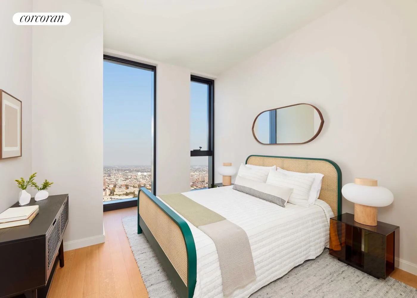 Rental residence 27G is a breathtaking 2bdrm layout featuring 10" lofty ceilings and full height windows which flank the open space offering an unparalleled eastern exposure of The Brooklyn landscape and Fort Greene Park. European white oak flooring in custom honey stain align the residence creating and indulgent warmth. Brooklyn Tower features custom designed kitchens by Gachot Studios with Absolute Black granite countertops, fully integrated suite of Miele appliances with Bosch dishwasher and Waterworks fixtures in matte black finish. Bathroom suites showcase custom-designed details with light mahogany vanities and dolomite stone throughout.