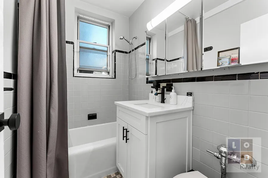 A hallway with two spacious closets leads to the renovated bathroom, with shelving in the bathtub/shower, a new vanity and sink, new toilet, oversized mirrored medicine cabinet and light, and a window for natural light.