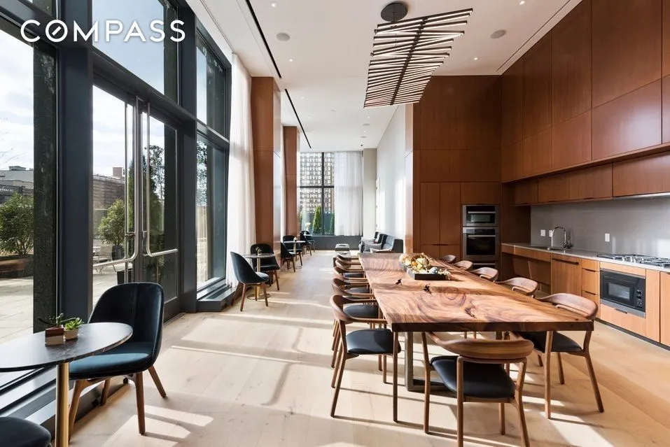 Residents enjoy 10,000 square feet of first-class amenities, including a 24/7 attended lobby, a curated library by McNally Jackson, a state-of-the-art fitness center by The Wright Fit, a residents’ lounge with catering kitchen, a children’s playroom, a pet-grooming studio, and an expansive rooftop terrace with lush plantings and panoramic city vistas.