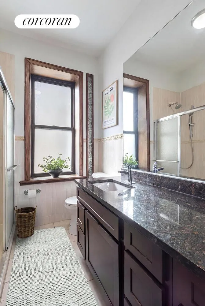 The windowed Bathroom has a shower stall and large vanity sink with granite counter.