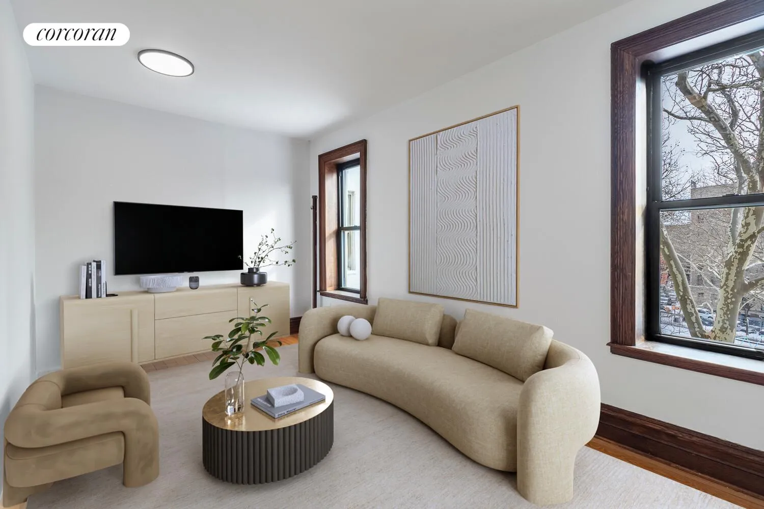 This charming 2-Bed-Flex-3-Bed, 1-Bath, Top Floor apartment gets wonderful natural light from an unobstructed northern view over turn of the century townhouses and an eastern view of tree filled Alexander Hamilton Playground Park.