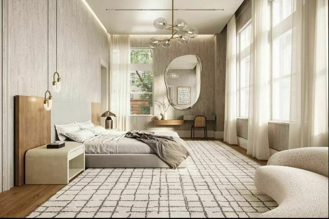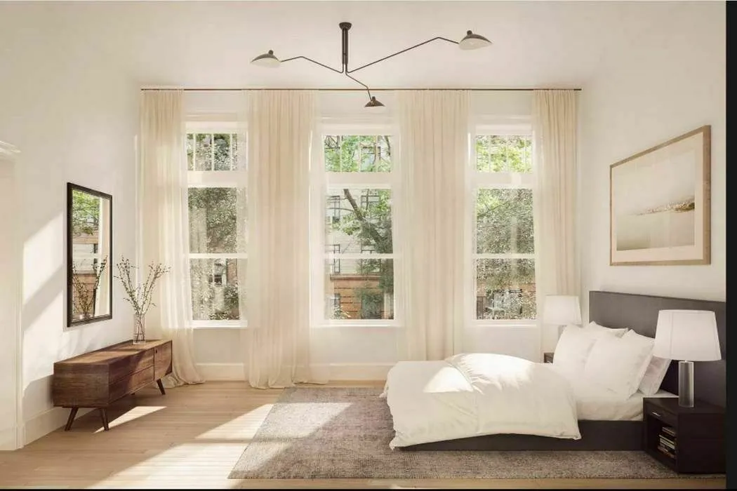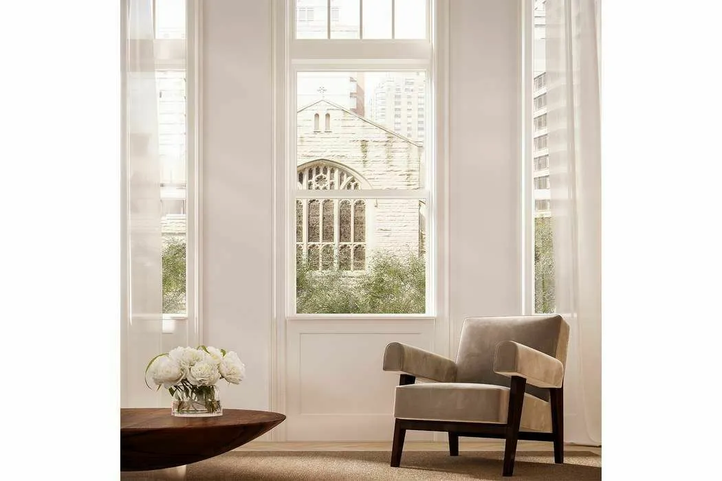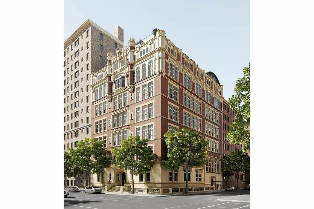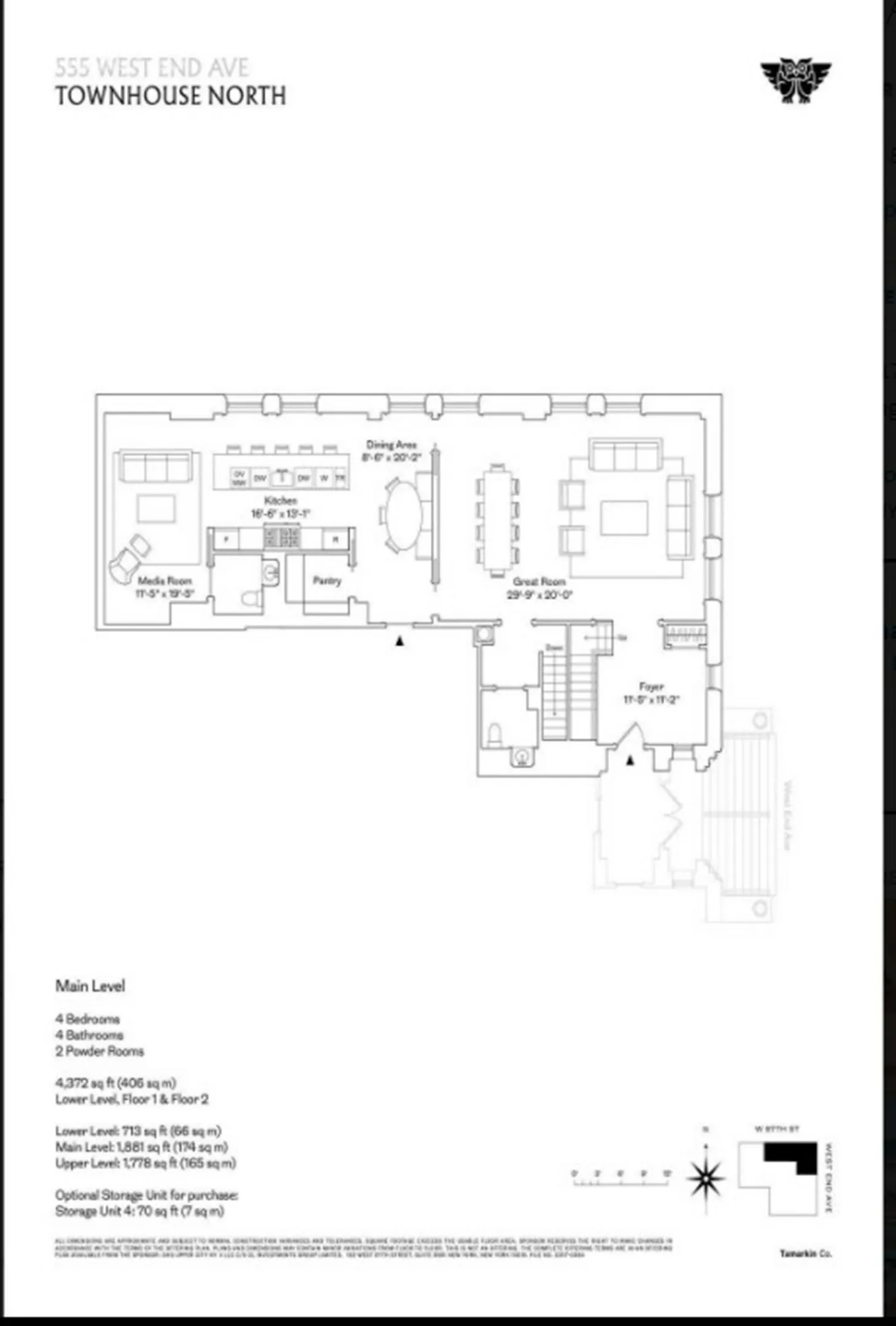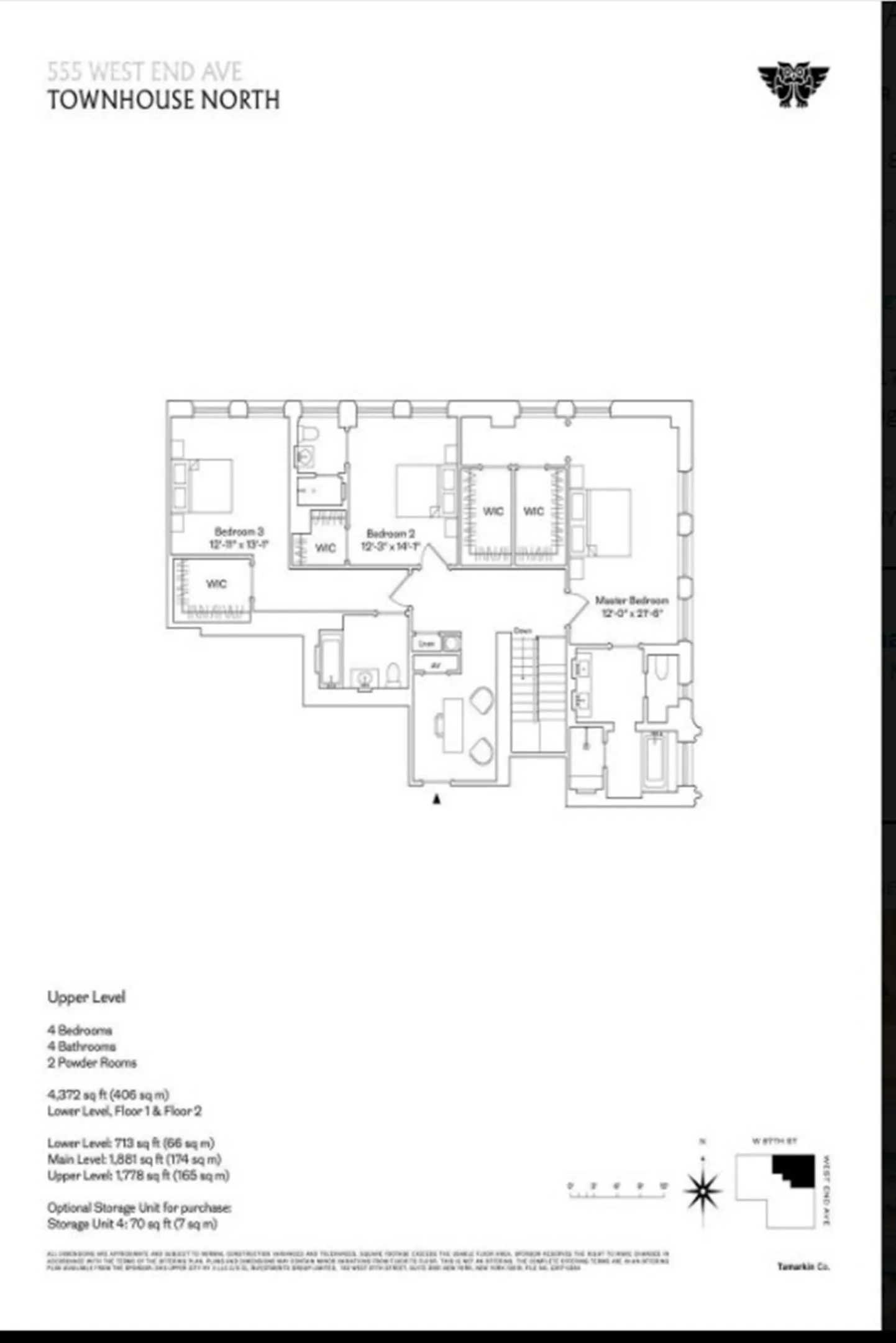 Townhouse Νorth at 555 West End Avenue is a sun-flooded corner triplex with 12+ft ceilings, 4,372 SF of light-filled volumes of space, and the craftsmanship and graciousness of classic co-ops. This unique residence has four bedrooms, each with en suite baths, two powder rooms and a private entrance. One of just 13 singular residences in Tamarkin Co.’s newly completed extraordinary condominium conversion of a landmarked former school, Townhouse North was designed for those who love the feel of a house but want full service, security and amenities. The 29-ft Northeast corner Great Room has five 9-ft. tall sash windows that usher in light throughout the day. Considered one of the best kitchens in New York City, the enormous eat-in kitchen, crafted by millworker extraordinaire Christopher Peacock, has a 15-ft long polished Arabescato marble slab breakfast bar, countertops and backsplash, fluted glass cabinet fronts, Nanz hardware, vented Wolf 48-inch double oven range, SubZero fridge and separate freezer, wine storage, microwave and warming drawers, two dishwashers, Lefroy Brooks faucets, garbage disposal and pot filler. An additional fun feature of this kitchen is the adjacent TV room/lounge. Three of the four bedrooms (all en-suite) are located on the second floor. The corner primary bedroom is sun-flooded with east light; two additional bedrooms are bright and face north to the tree-lined block. The primary bedroom features 12-ft-8” ceilings, two walk-in closets and a five fixture primary bath with Calacatta gold marble slabs, custom white oak vanities by Christopher Peacock, double sinks with Lefroy Brooks fixtures, radiant-heat floors, towel warmer, steam shower and private Toto Neorest smart toilet. En suite secondary bedrooms have walk-in closets; baths have the highest quality stone and hardware. Also on the bedroom floor is a home office nook. A fourth en suite bedroom is located on the lower level. A laundry chute on the bedroom floor is a fun way to send laundry to the large laundry room on the lower level, which has a full size vented washer and dryer, extensive storage and laundry sink.