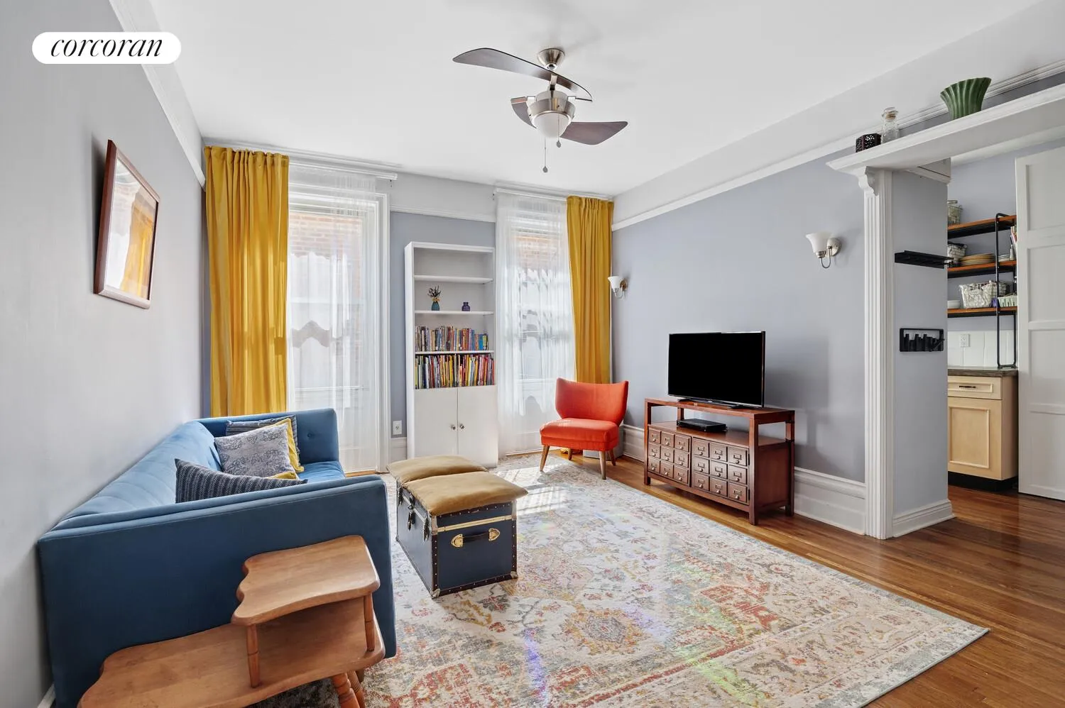 Enter Apartment 4I through a welcoming hallway foyer with a coat closet. Your eyes are immediately drawn to the well-lit pre-war living room, where beautifully decorative moldings frame the windows that bring in lovely eastern light. To the left, in a wing of its own, are the two bedooms and bath, creating a sense of privacy from the main living area. The apartment features beautiful narrow-strip hardwood floors throughout, refinished approximately ten years ago.