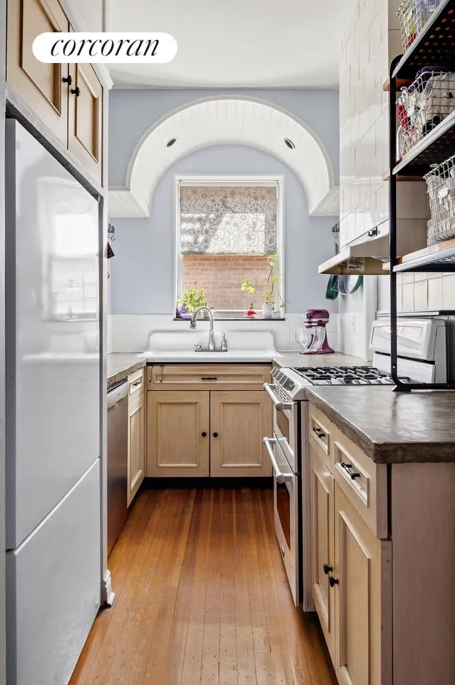 The living room flows seamlessly into the dining area and kitchen, creating an easy layout for entertaining. Even though you don't have a formal dining room, the area can comfortably accommodate a table for six. The kitchen is a standout feature, highlighted by a striking arched window set within a deep architectural niche - a beautiful pre-war detail that creates the perfect ledge for plants or decorative accents. A vintage-style stove, purchased in 2016, adds a touch of classic New York character, complemented by concrete countertops. The refrigerator, a high-end matte white by Fisher and Paykel, and a stainless steel Bosch dishwasher, were purchased in 2023.