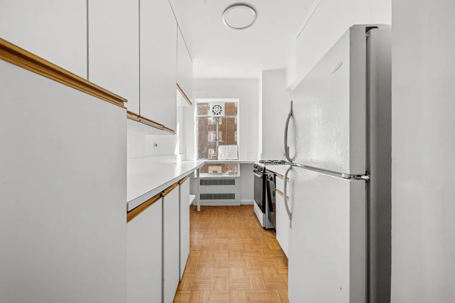 The thoughtful A-line layout separates the private quarters from the entertaining rooms, creating a natural flow. The oversized primary bedroom features an en-suite bath and open southern views over West End Avenue. The second bedroom is equally generous, also facing south. Closet space throughout is abundant and well-proportioned.