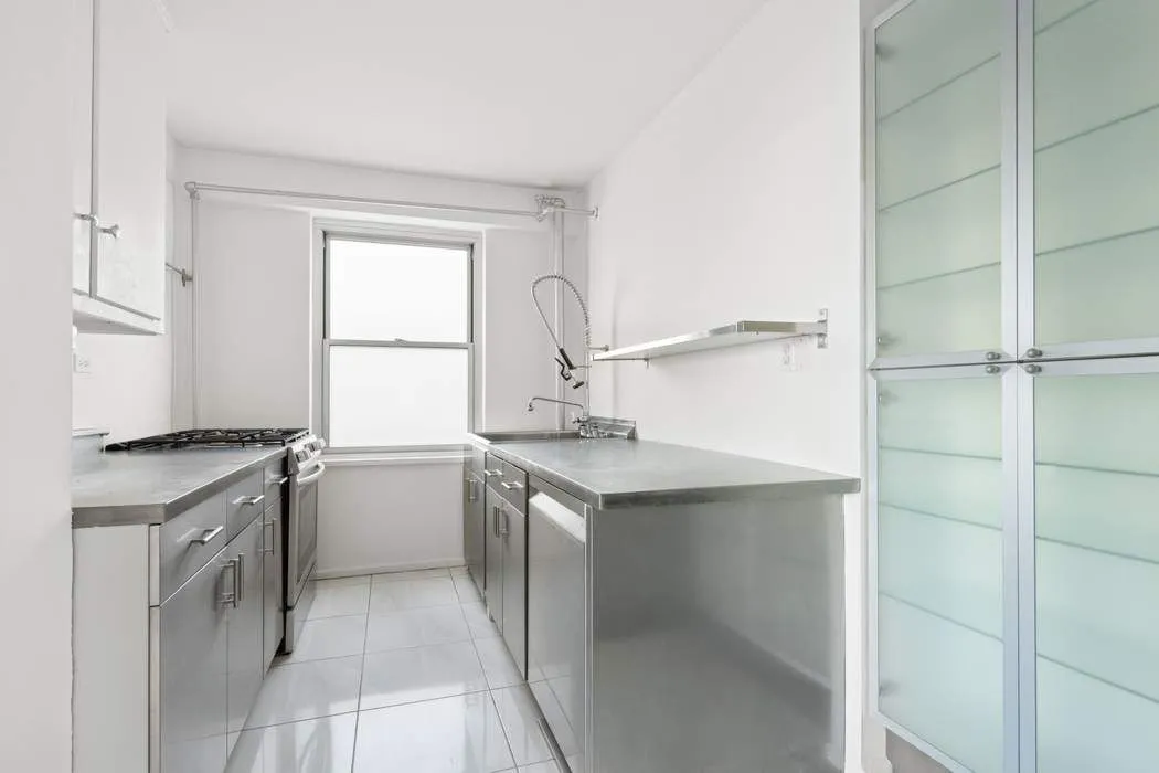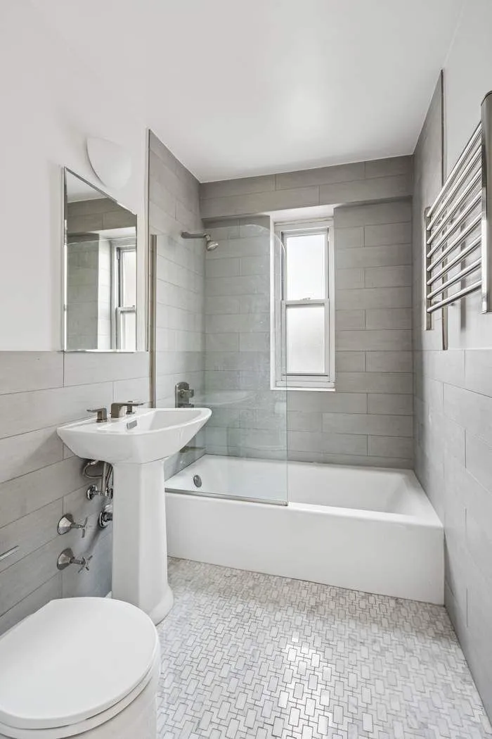 The windowed kitchen is sleek and refined, featuring stainless steel finishes, a brand-new dishwasher, and a five-burner gas range. The generously proportioned bedroom enjoys southern exposures and offers two well-sized closets. The fully renovated, windowed bathroom is finished in calming gray subway tile, complemented by sophisticated designer geometric floor tile. Brand-new maple plank flooring throughout creates a clean, bright, and cohesive aesthetic.