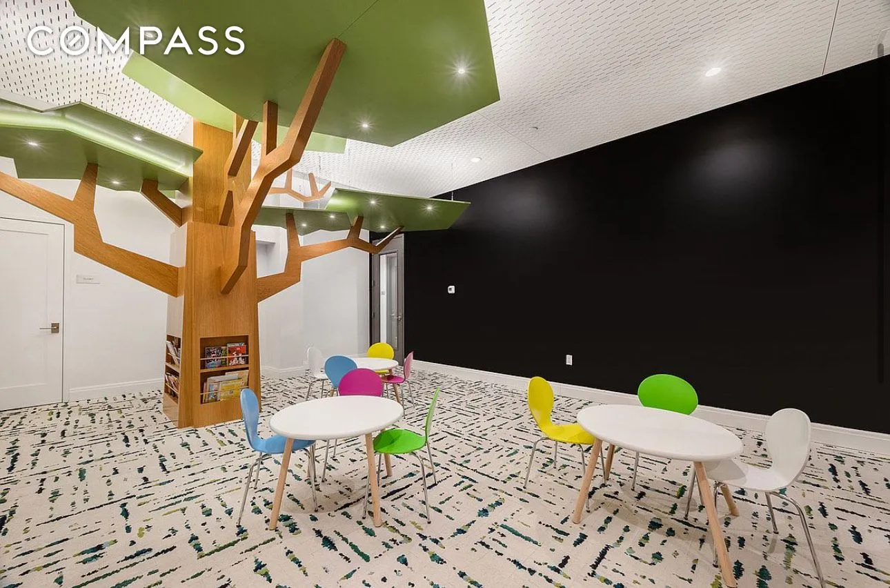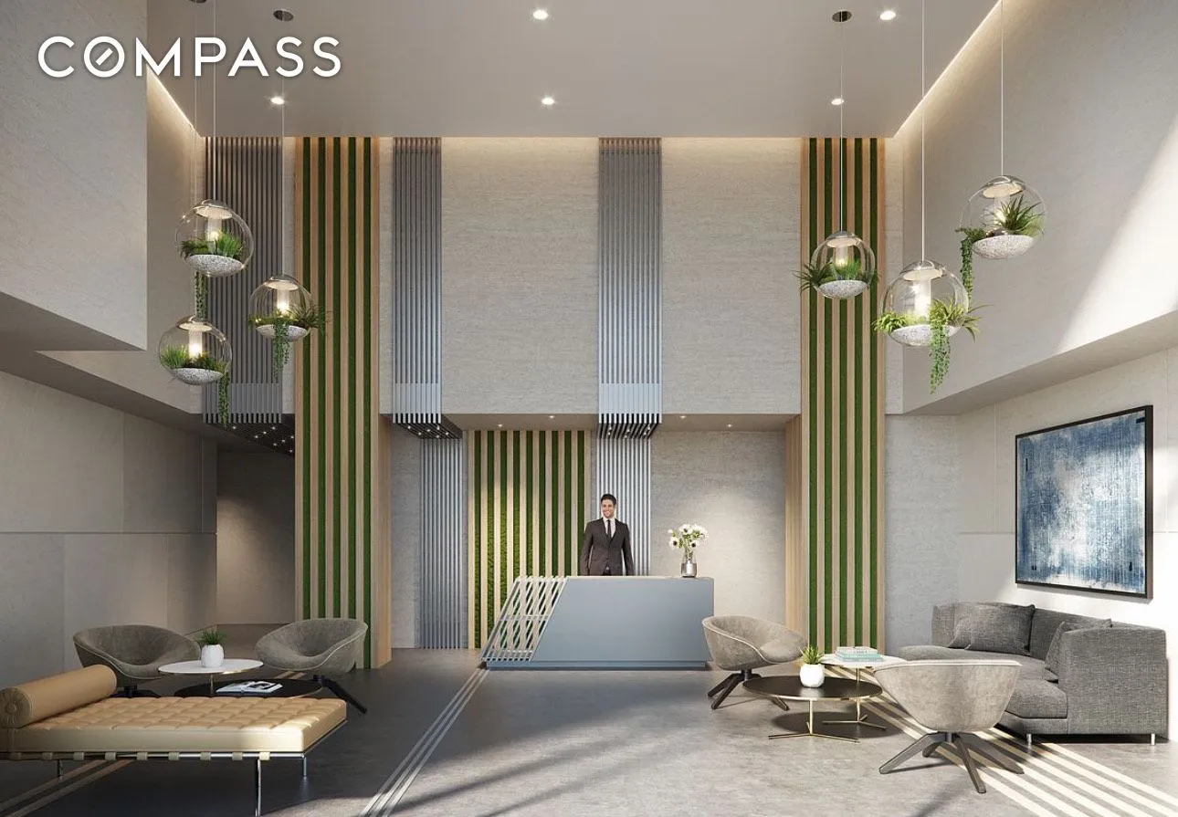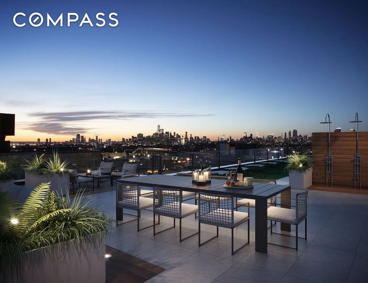 Residents enjoy over 12,000 SF of indoor and outdoor amenities including landscaped courtyards with dog run and playground, rooftop terrace with Statue of Liberty and skyline views, attended lobby, fitness center with yoga studio, music room, children’s playroom, and resident lounge with co-working and game room.