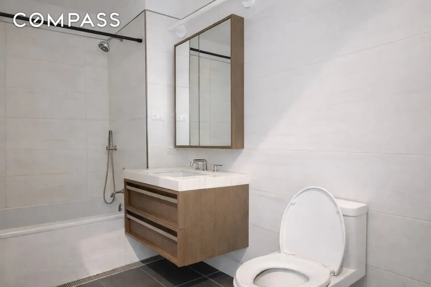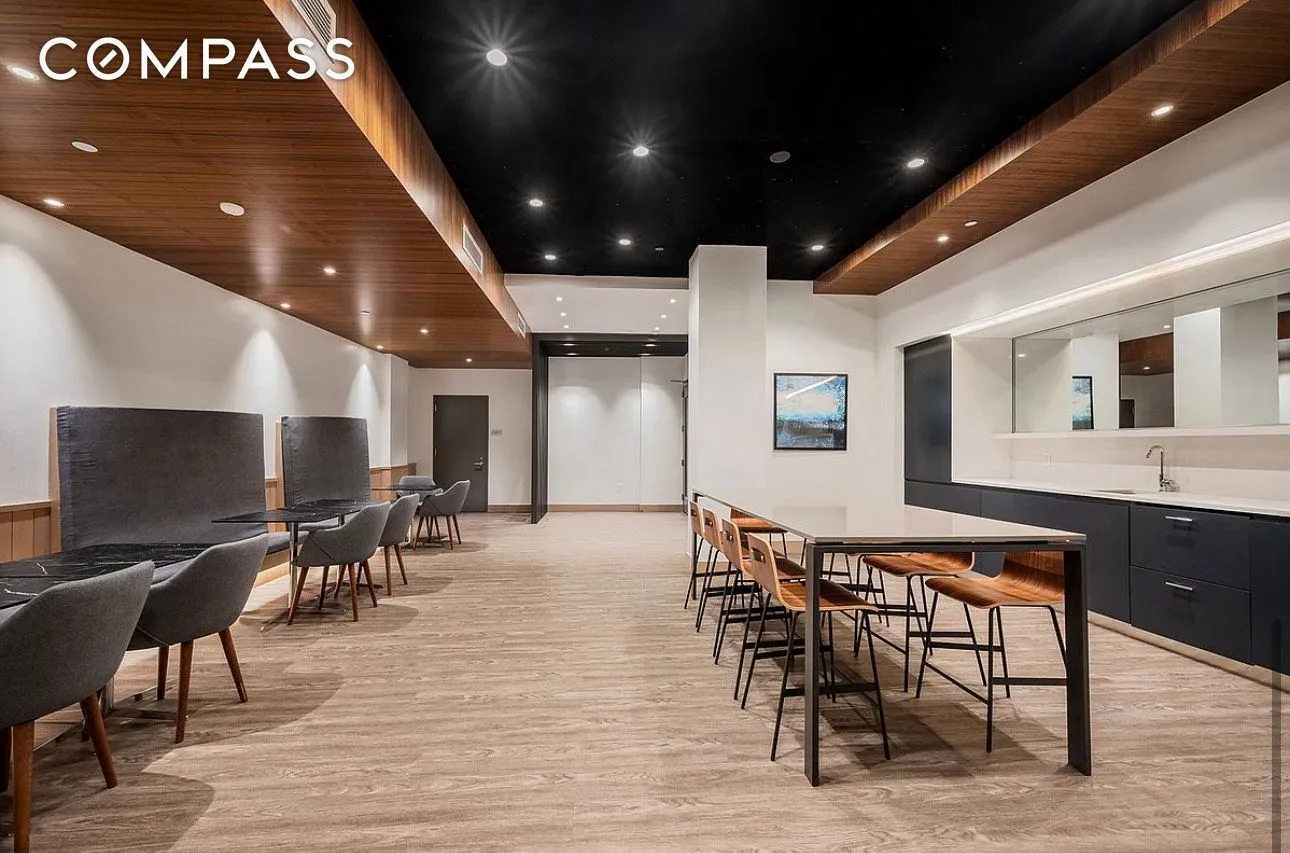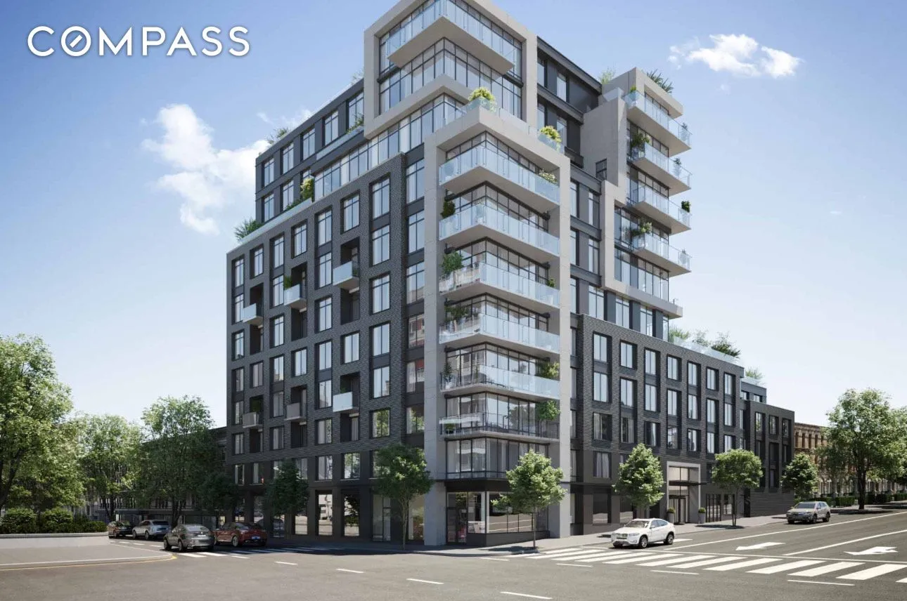 Residents enjoy over 12,000 SF of indoor and outdoor amenities including landscaped courtyards with dog run and playground, rooftop terrace with Statue of Liberty and skyline views, attended lobby, fitness center with yoga studio, music room, children’s playroom, and resident lounge with co-working and game room.