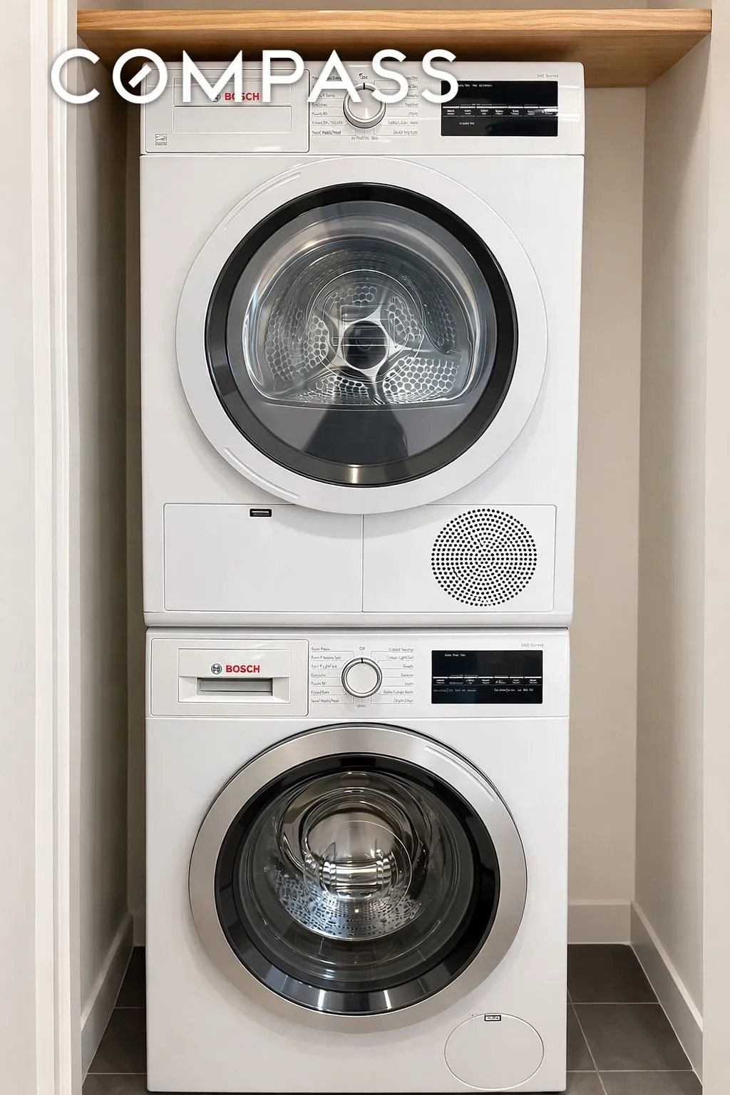 The private primary suite features excellent closet space and a spa-like bathroom with deep soaking tub and custom vanity. Additional highlights include 7" European oak flooring, in-residence washer/dryer, double-paned noise-isolating windows, and an individually controlled multi-zone heating and cooling system.
