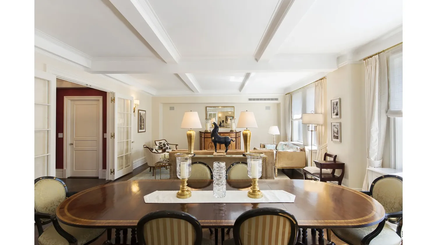 A private keyed elevator opens into an elegant gallery with sweeping southern Hudson River views that extend through the kitchen and family room, while the formal living room enjoys open northern city vistas over West End Avenue. The expansive 28-foot living room features French doors leading to the library-easily used as a guest suite or office/study-and the adjoining formal dining room, creating an ideal flow for both entertaining and daily living.