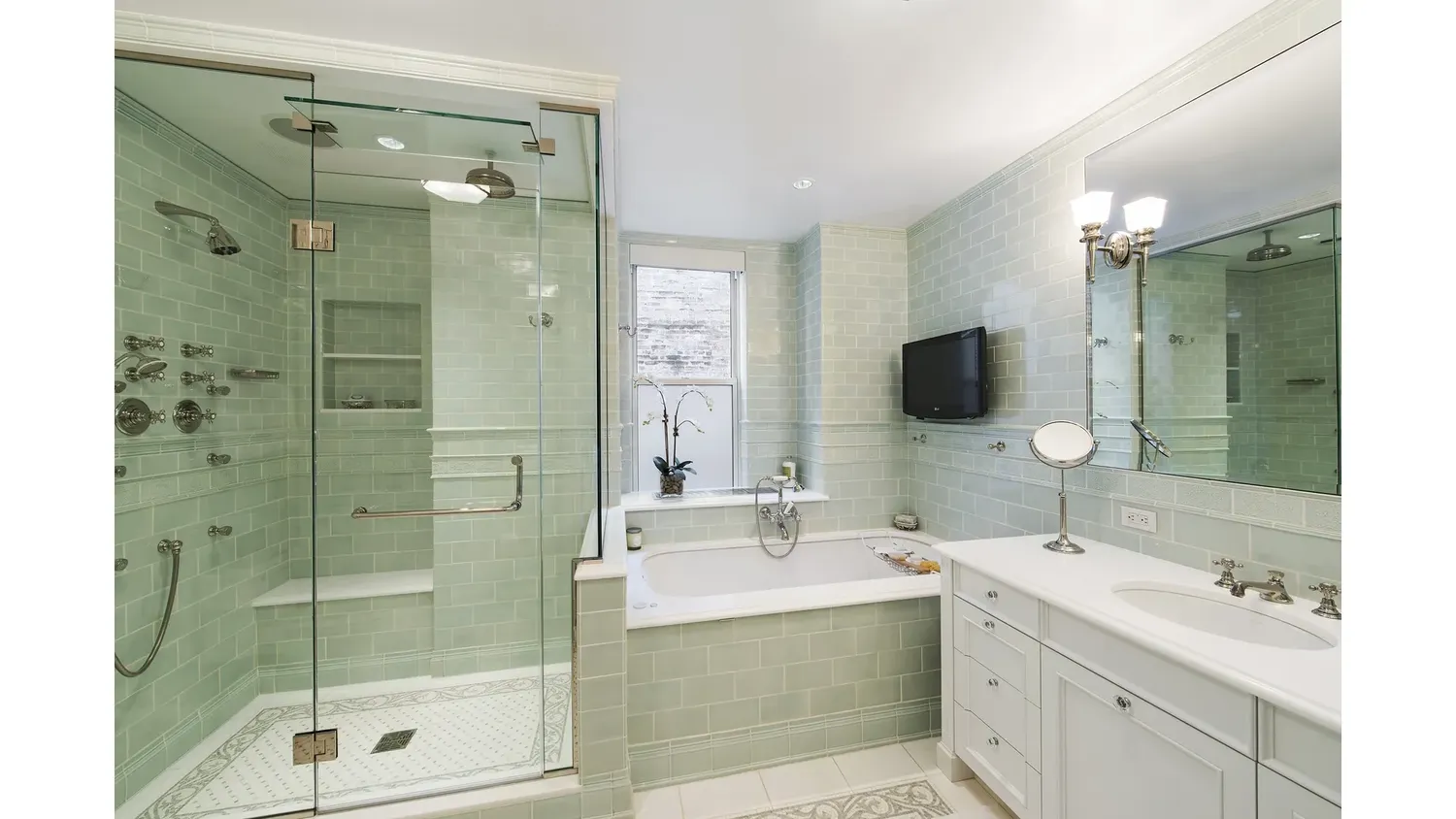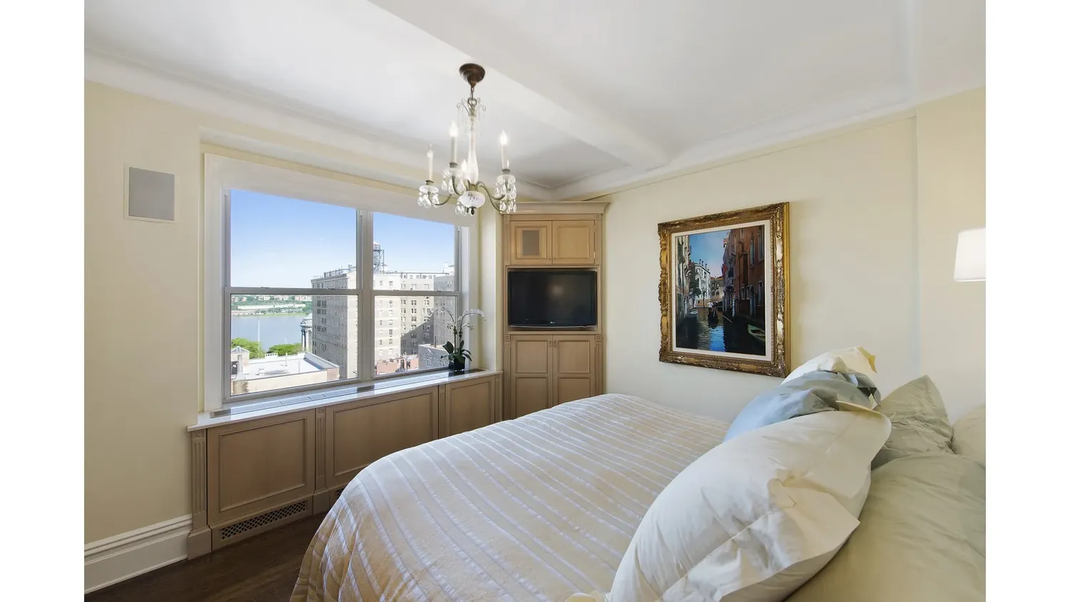 The west-facing primary suite captures stunning sunset and Hudson River views and features a wall of custom built-ins. The en-suite bath is finished with a Thassos marble vanity, Jacuzzi soaking tub, separate rain shower, Waterworks fixtures, and nickel Herrington Brass fittings. Three additional bedrooms-two of which enjoy open city views over West End Avenue-are complemented by three additional custom bathrooms, all appointed with Waterworks fixtures.