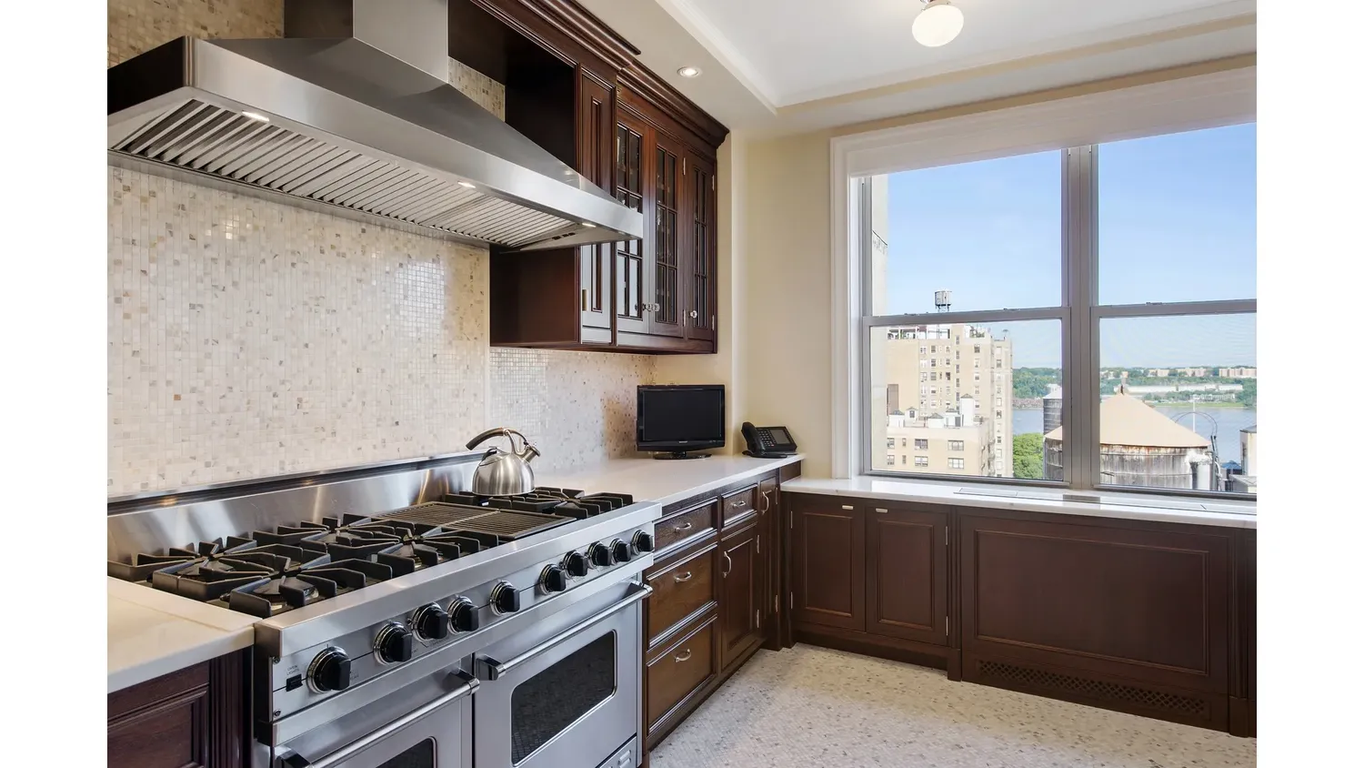 The oversized, fully custom eat-in kitchen is outfitted with top-tier appliances, including a Miele cappuccino machine, Viking six-burner range with grill, warming drawers, Sub-Zero refrigerator/freezer, and convection microwave. A marble island, crystallized milk-glass countertops, Calacatta Gold mosaic backsplash, custom cherry cabinetry, and a lava stone banquette complete the space, all complemented by exceptional river views.