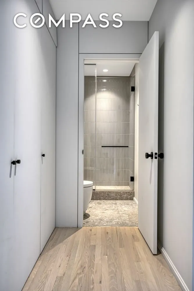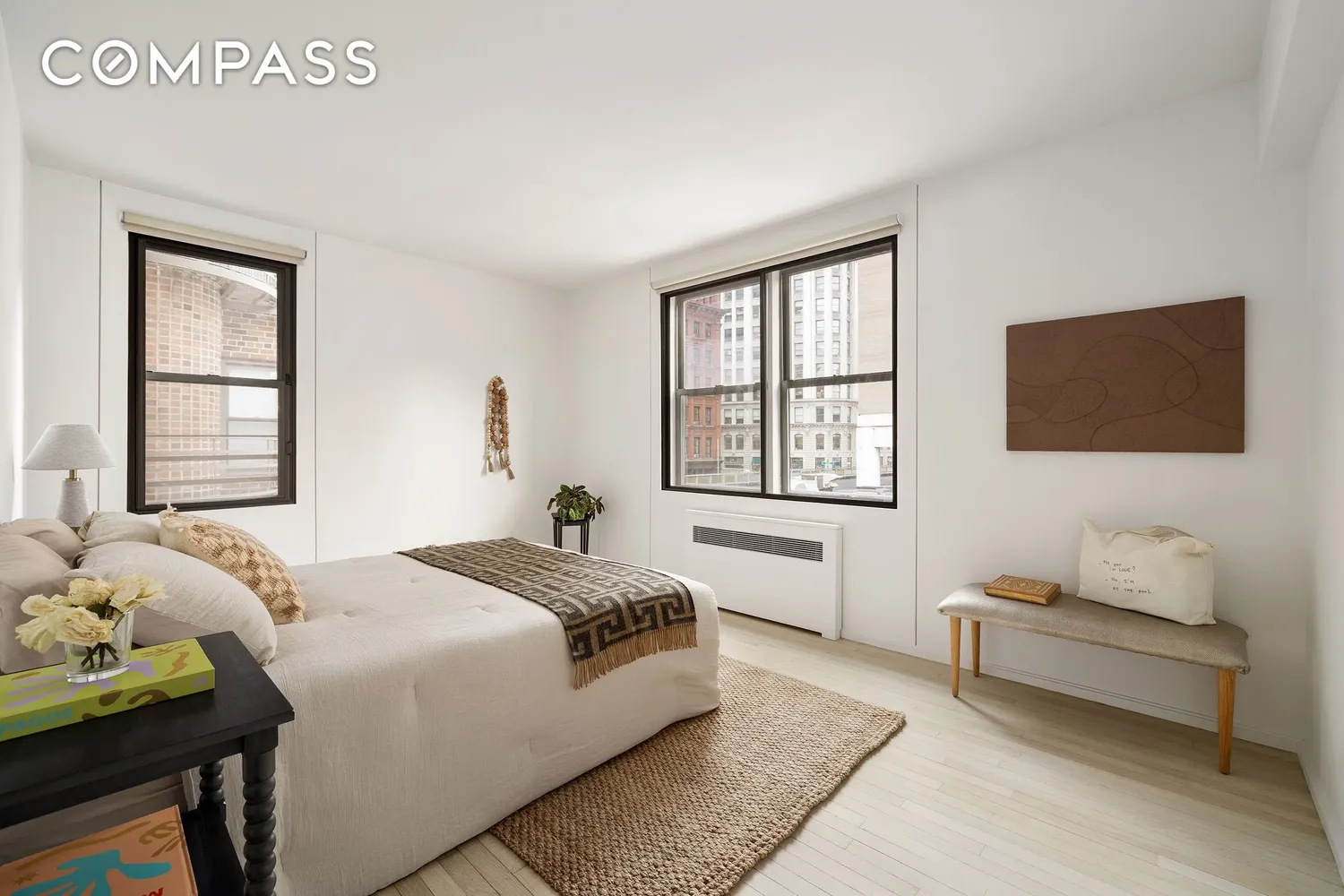 The serene king-size bedroom has double exposures, CitiQuiet windows, and blackout shades. The windowed bathroom features a walk-in rain shower and refined finishes.