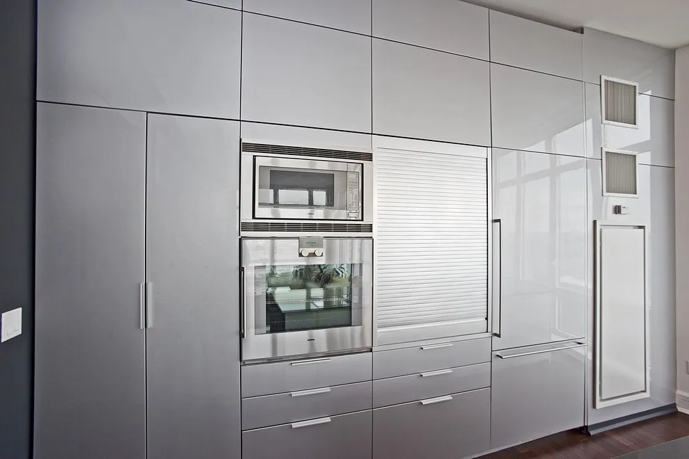 The open Living/Dining room has a renovated chic minimalistic kitchen by Pedini with Gaggenau oven and induction stove, Miele refrigerator and Bosch dishwasher.