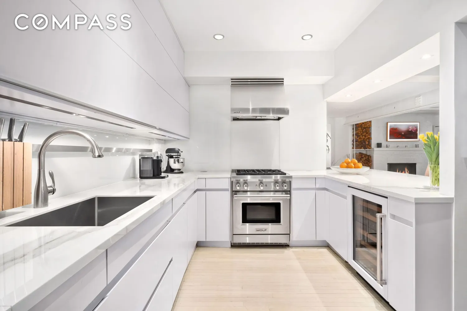 An enormous windowed entry foyer (measuring nearly 22’ x 11’) features an entire wall of floor to ceiling custom millwork cabinetry on one side and an exposed brick wall on the other, along with a deep walk-in closet. This massive space currently functions as an extravagant mudroom and piano room, but could easily transform to a fabulous home office or library. The majestic great room spans an impressive 33’ x 23’ and features exposed original cast iron beams, elegant cove lighting, four large west facing windows and a magnificent wood-burning fireplace with black stone hearth. A sleek, modern chef's kitchen is partially concealed and opens on one side with a long counter and breakfast bar. It is deftly outfitted with top of the line appliances, including a stainless steel Wolf range and hood, integrated 36” Sub-Zero refrigerator, integrated Miele dishwasher, and Sub-Zero wine fridge. Plentiful custom cabinetry conceals ample storage including a kitchen pantry. The commodious dining area has room for a massive dining table and gets natural light through its own southern windows. A sliding barn door opens to reveal the private bedroom wing.