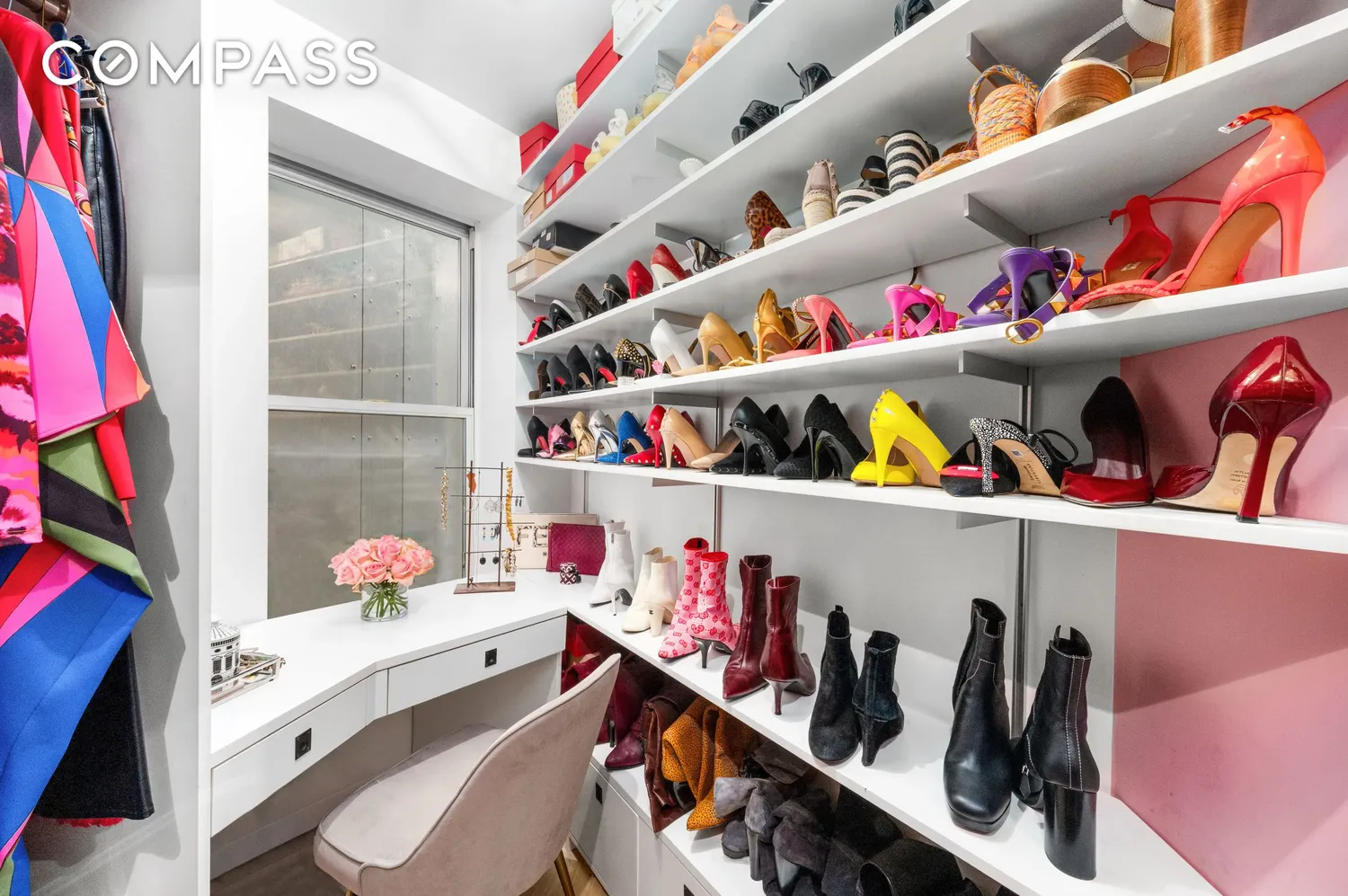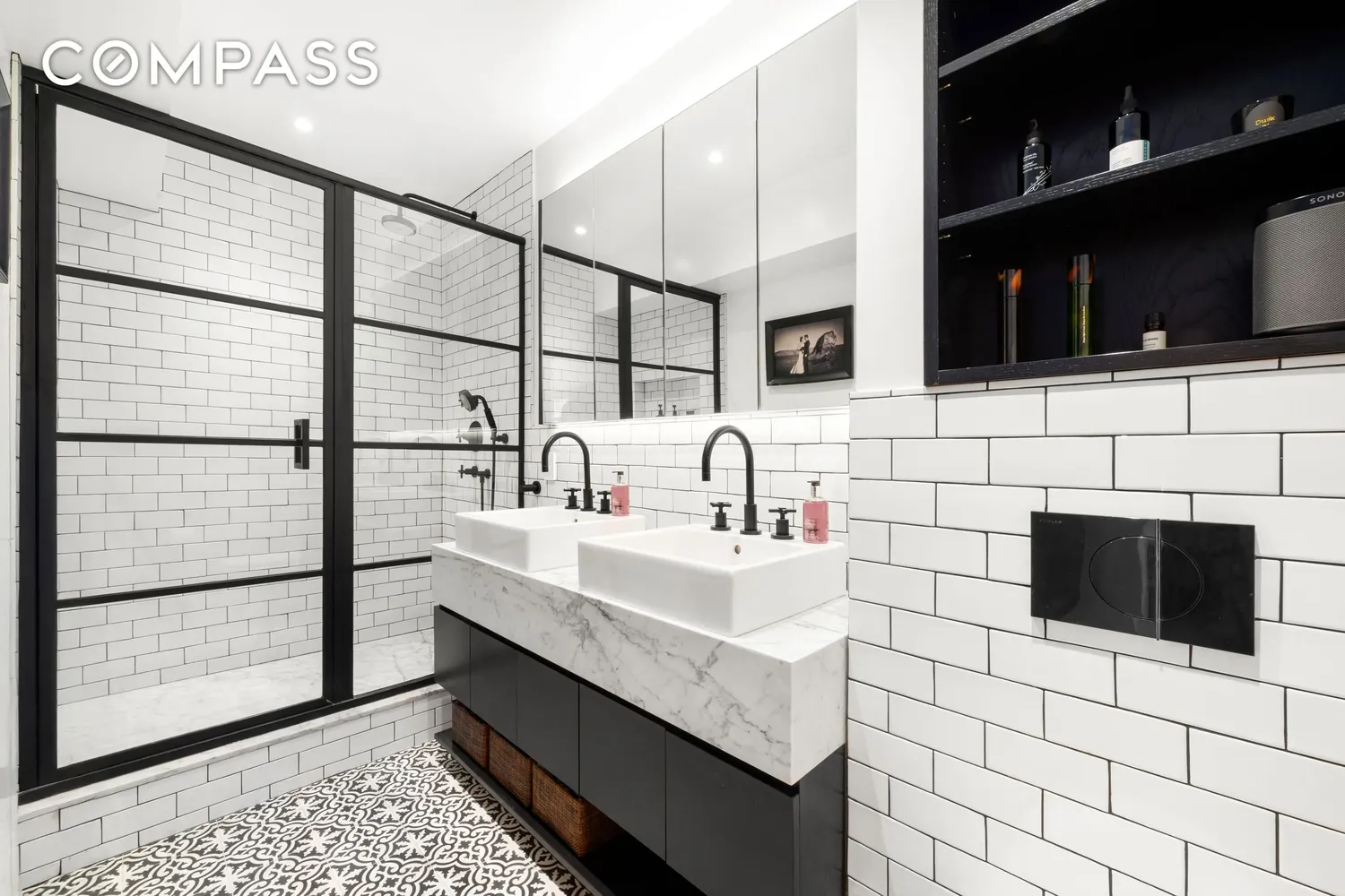 A long hallway/gallery ends at the spectacular light-filled primary bedroom. This massive suite includes a gracious 15’ x 16’ sleeping area with three large east facing windows with electronic black-out blinds, in addition to two glorious built-out and windowed walk-in closets, one of which could be a home office. The ensuite bathroom includes double Duravit sinks, a large glass and iron enclosed shower with marble slab floor, Moroccan floor tile, Duravit wall-hung commode, white subway tile walls and black Kohler fixtures. The spacious second and third bedrooms share a bathroom across the hallway, which features double Duravit sinks, gold fixtures, decorative Moroccan tile wall above the tub, and two linen closets.