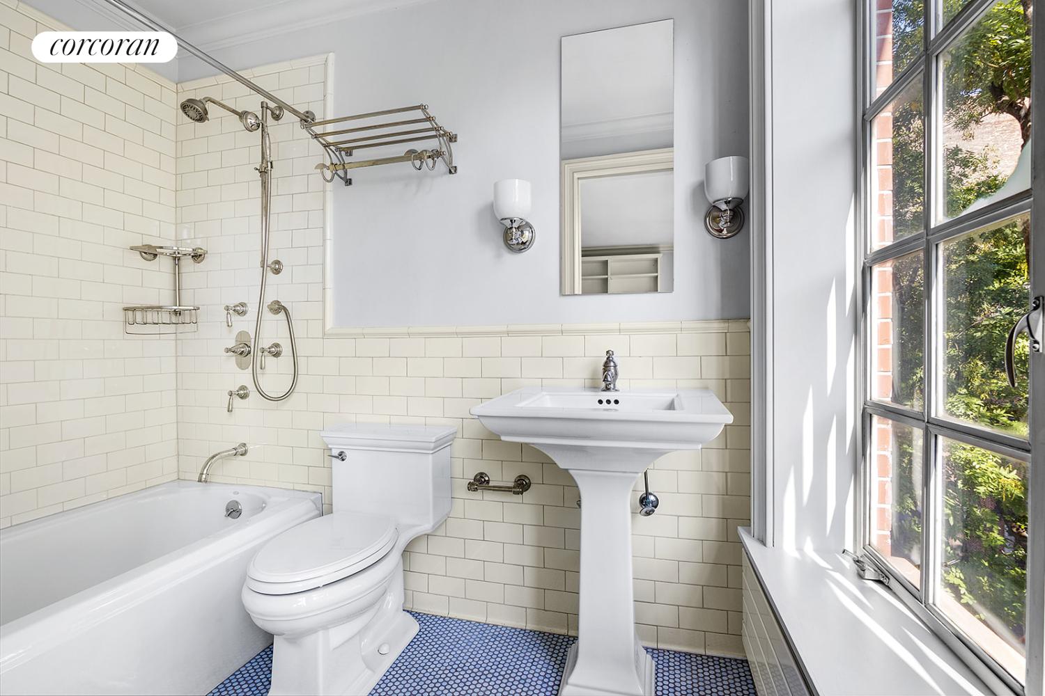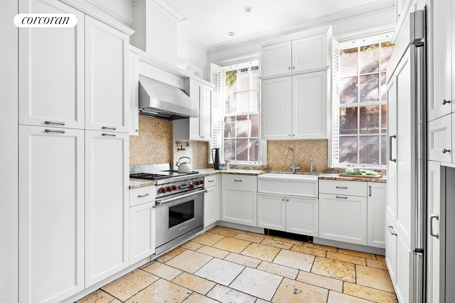 The parlor floor welcomes lavish entertaining and comfortable daily life with an open floor plan and soaring 11.5-foot ceilings. The result of smart architectural design and painstaking renovation, the kitchen is in the front of the parlor, allowing for extra high ceilings and beautiful garden views that fill the room with light. Floor-to-ceiling windows and garden greenery surround the separate dining area, an ideal place to dine amidst tranquility. Test your culinary skills in the open chef's kitchen outfitted with a vented Wolf range, oversized French door refrigerator, built-in microwave drawer, granite countertops, and an abundance of kitchen storage. Step outside and enjoy a herringbone-paved terrace and garden, ideal for al fresco dining and lounging. A powder room and coat closet complete this well-planned level.