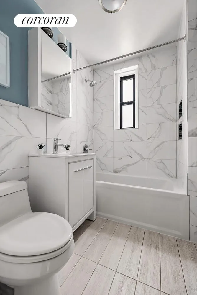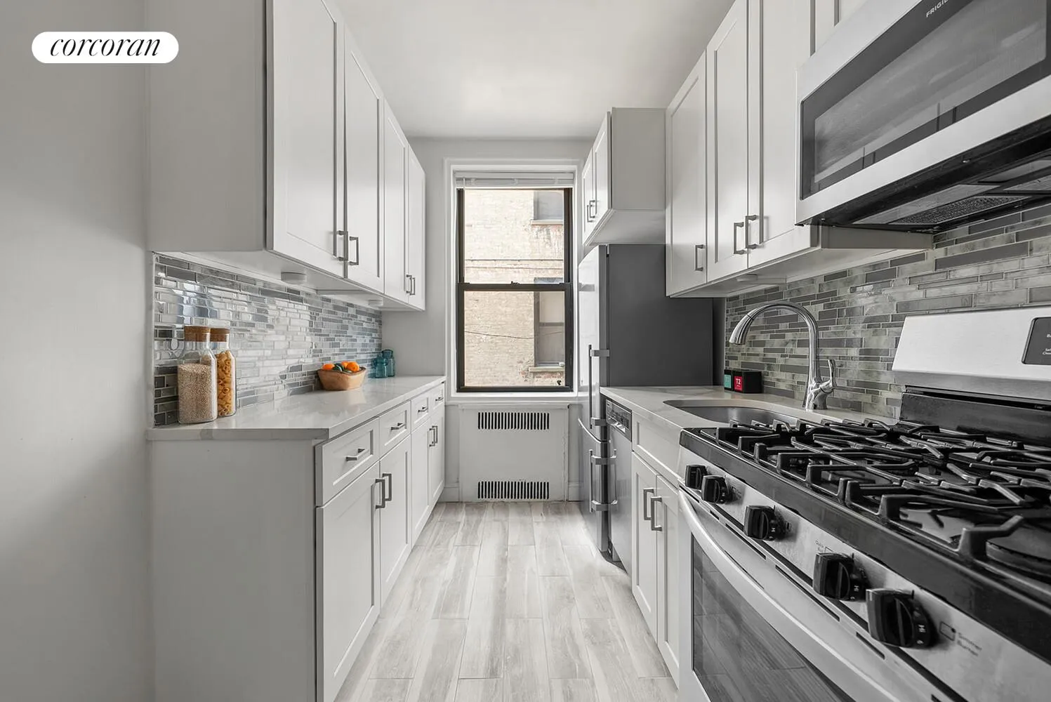 The newly reimagined kitchen is a standout feature, equipped with stainless steel appliances including a dishwasher and microwave. It boasts elegant quartz countertops, sleek cabinetry with abundant storage, and a large window that provides natural light and essential ventilation. Just across the hall, the windowed bathroom has been fully renovated with modern finishes, featuring a soaking tub and a contemporary vanity.