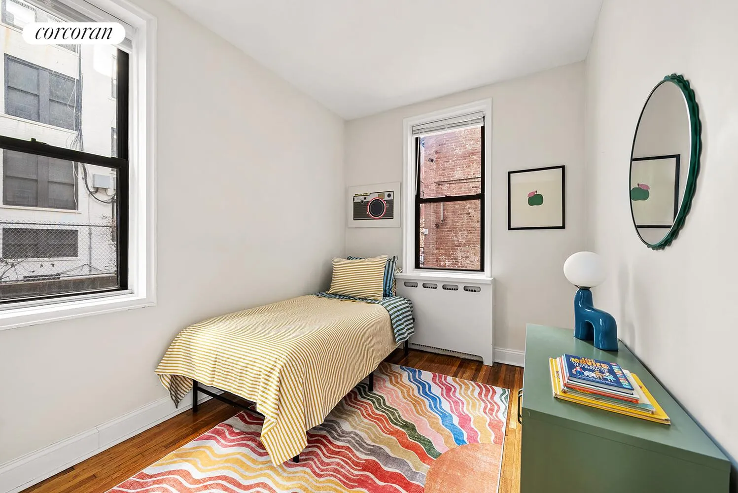 The primary bedroom is a massive, king-sized retreat that boasts double exposures and impressive dimensions. There is ample flexibility here for a sitting nook or a home office alongside a full bedroom set. The second bedroom, positioned for privacy, includes its own window and closet, making it the perfect space for a guest room, nursery, or dedicated workspace. Additional highlights throughout the home include high ceilings and multiple deep closets for excellent storage.