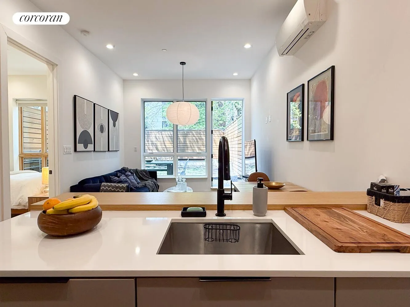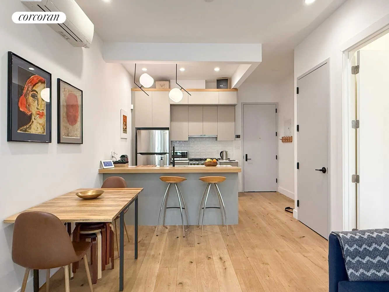 Indulge your culinary passions in the well-appointed kitchen featuring a breakfast bar, quartz island countertop, and high-end appliances including a Blomberg gas range, Bosch Silent Series dishwasher, and Fisher Paykel refrigerator. Whether you're a culinary enthusiast or a casual cook, this kitchen is designed to impress. With in-unit laundry facilities and central air conditioning, convenience and comfort are at your fingertips.