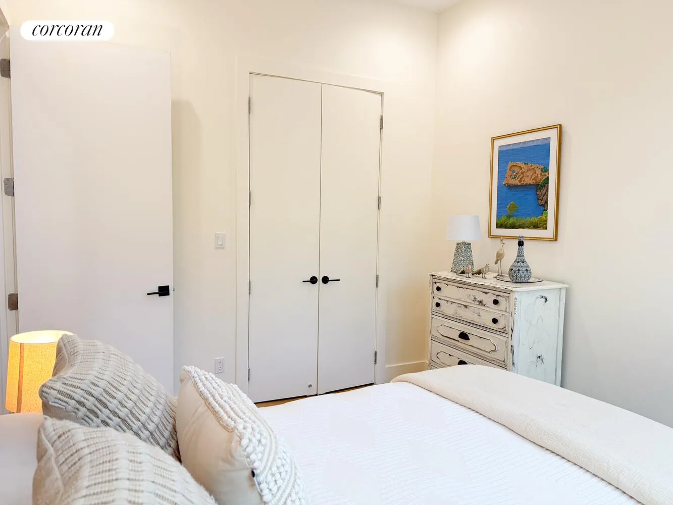The bedroom is spacious, featuring a beautiful queen-sized bed, two nightstands, and ample closet space, with a large window facing out onto the garden.