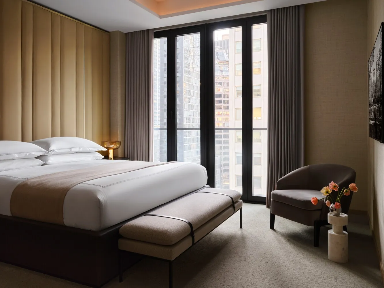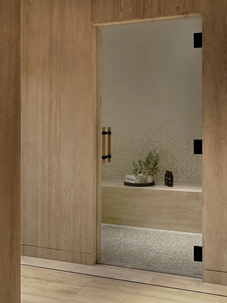 In the king-size bedroom suite, full-height French doors open onto a west-facing terrace for dramatic sunset cityscapes. The bedroom also includes a custom Molteni walk-in closet and a spa-inspired windowed en-suite bathroom with French Vanilla honed radiant heated marble floors, a custom-built double vanity with Ellevi storage, a wall-mounted Duravit toilet, an oversized MOMA Design soaking tub, and a Salvatori Crema d'Orcia limestone walk-in steam shower.