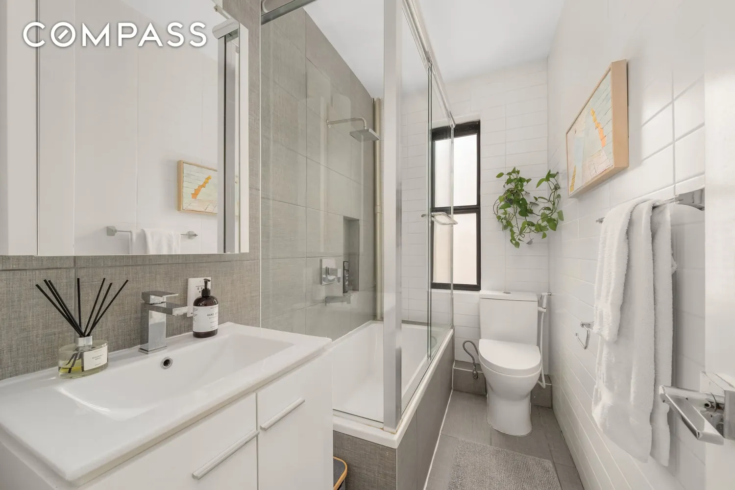 Presenting a renovated, bright, and spacious three‐bedroom, one-bath residence with 9-foot ceilings, beautiful hardwood floors, and a gracious layout. A sun-filled and generously proportioned living room anchors the home, while the windowed eat-in kitchen is outfitted with ebony shaker-style cabinetry, Caesarstone quartz countertops, a glass backsplash, and stainless-steel GE appliances. The home features a large primary bedroom, two well-appointed guest rooms, and a luxurious bath, all thoughtfully finished to complement the apartment’s bright, contemporary aesthetic.