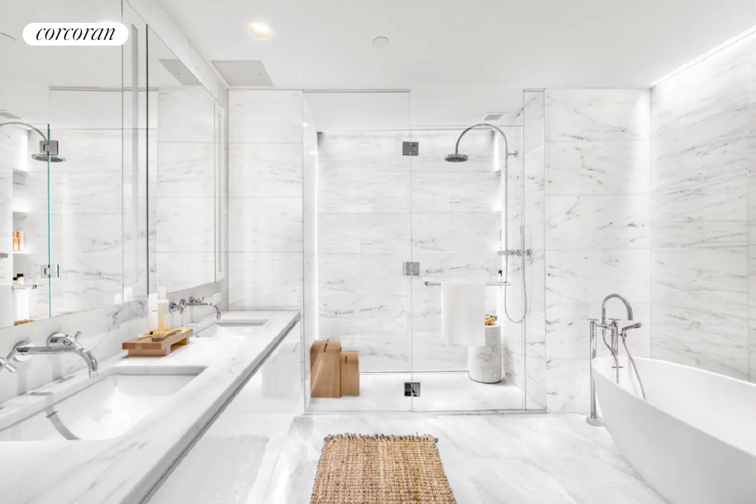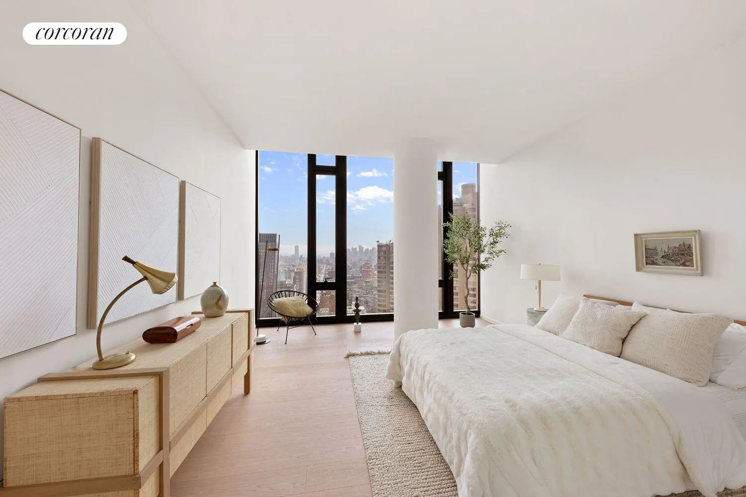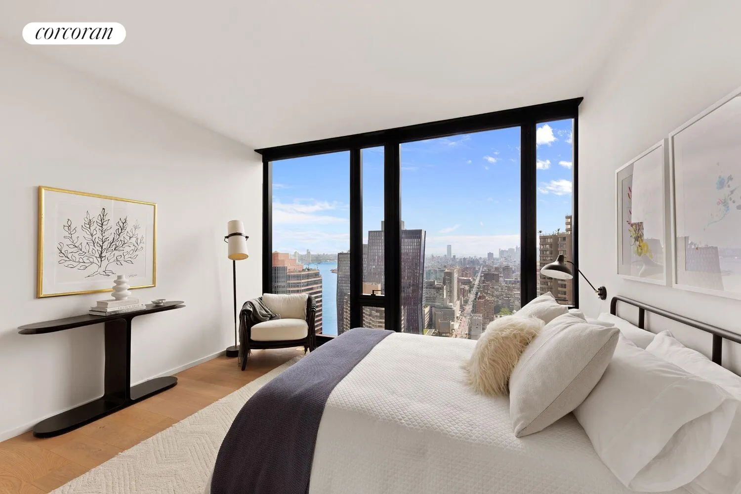 Designed by Meier Partners, the residence interiors are a striking contrast to the black glass exterior, reflecting a white color palette. Living spaces are immersed in natural light radiating through the floor-to-ceiling windows. White oak floors are found in all residences and open kitchens boast white Calacatta Lincoln marble counters, Dornbracht fixtures and Gaggenau appliances clad in custom-crafted Italian white lacquer. Each residence is equipped with a built-in Crestron smart home system that regulates temperature, lighting and the motorized window shades. These functions can be seamlessly controlled by residents through any iOS or Android device.