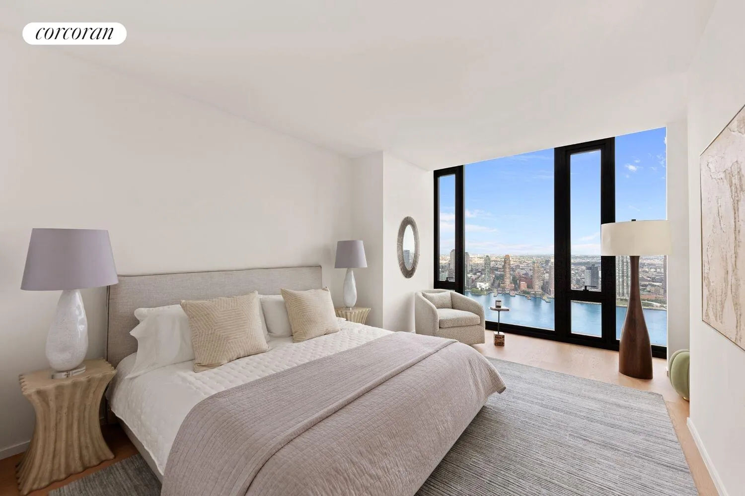 Residence ΡΗD at One United Nations Park is a 3,831sf four bedroom, four bathroom plus powder room, Duplex residence with a dramatic double-height great room and ceilings soaring 20 feet high. Perched on the southeast corner and flooded with sunlight, the gracious layout features a separate den/home office, eat-in kitchen with large island, and an internal private elevator. The primary suite boasts a walk-in-closet and grand primary bathroom with double vanities and freestanding tub. The floor-to-ceiling windows throughout highlight the river and city views down the avenue and beyond.