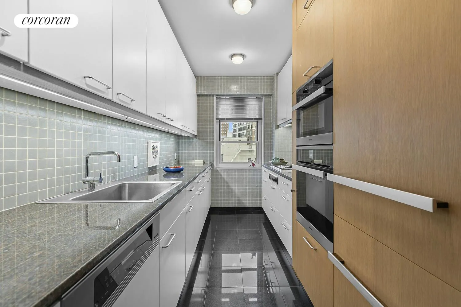 The living and dining areas are thoughtfully designed with symmetrical columns and intentional insets, creating depth and emphasizing the symmetry of the space. Lovingly maintained with the woodwork and lines of a fine yacht, you are enveloped in comfort and luxury. Please note the carpet is not transferrable, but the stunning parquet floors as seen in the bedroom photos, run throughout the living area. The spacious bedroom easily accommodates a king-sized bed, a chaise, and a large dresser, as well as a desk, and features abundant closet space, including a walk-in closet that is ready to be converted into a home office. The dappled sunlight and views of Grace Church add to the serene ambiance. For culinary enthusiasts, the kitchen is a highlight. It boasts Dakota Mahogany granite countertops, Bisazza Tile backsplash and walls, Allmilmo German cabinetry, and top-of-the-line Miele appliances, including ovens, dishwasher, refrigerator, and a Gaggenau cooktop. The sleek galley design offers ample space for efficient meal preparation, with thoughtful touches like a pull-out step stool, a tall slide-out pantry cabinet, and pull-out shelves in the base cabinets. Dinner will be superb!