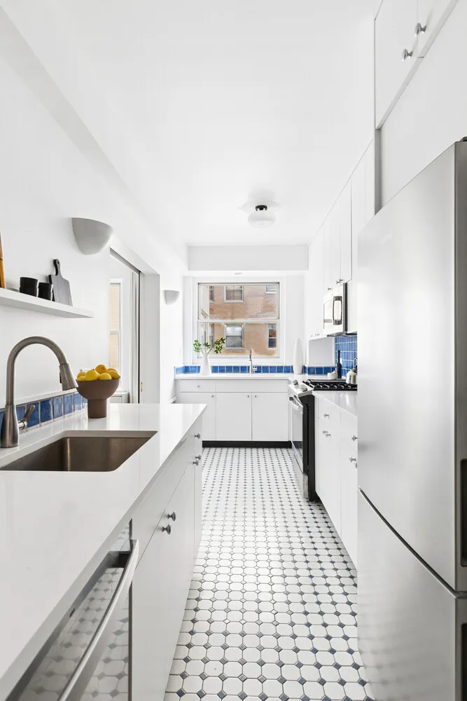 The large, windowed kitchen features a spacious eating area and brand-new appliances. Throughout the home, original details have been meticulously preserved, including stunning herringbone floors, solid oak parquet flooring in the bedrooms, and a dramatic foyer adorned with original black-and-white marble tiles in a striking harlequin pattern.