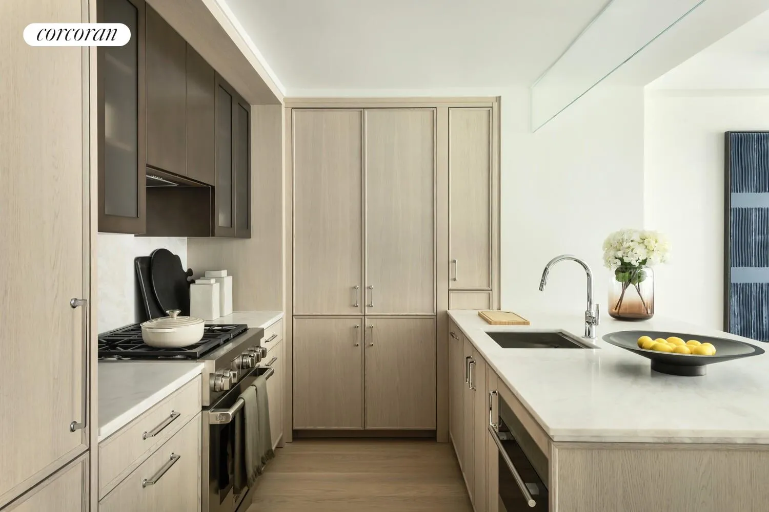 Residence 10D boasts a custom Italian kitchen by Boffi featuring a hand selected honed Namibia Rose marble countertop and backsplash, white oak cabinetry, fluted, reflective bronze upper doors and Waterworks polished chrome hardware. Professional-grade appliances include Sub-Zero refrigerator, Wolf range, Wolf speed oven, wine fridge, and Cove dishwasher. No expense has been spared.