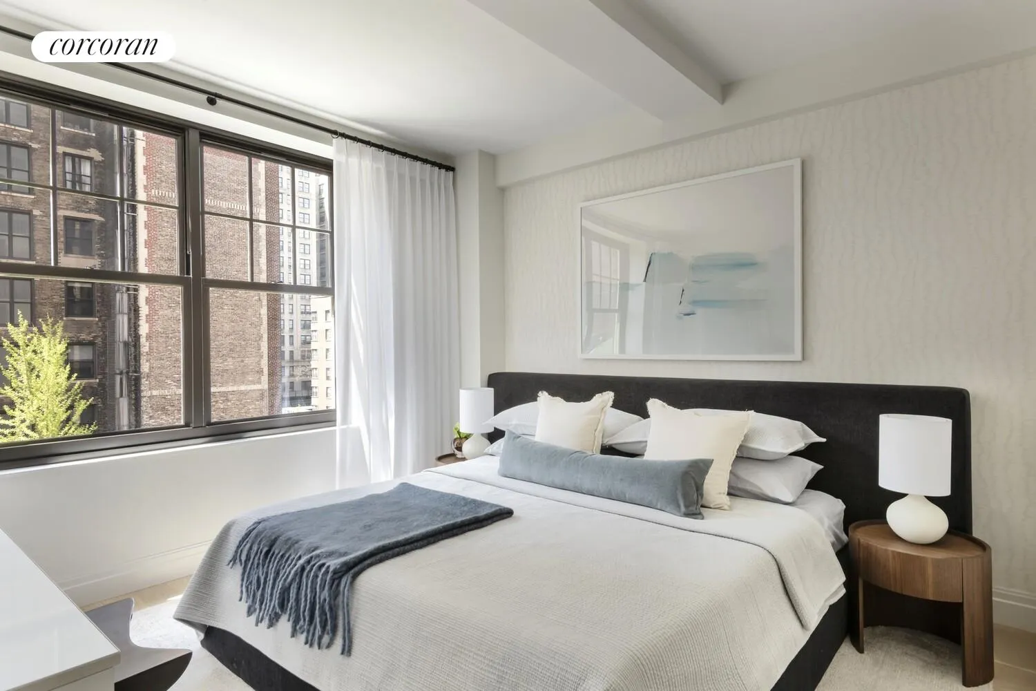 The primary bathroom offers a custom Thomas Juul Hansen designed white oak vanity with recessed medicine cabinet and integrated facial lighting, Volakas marble counters, flooring and walls, waterworks fixtures in polished chrome, radiant heated flooring, and a Toto wall mounted toilet. An oversized closet can be found in the primary bedroom.