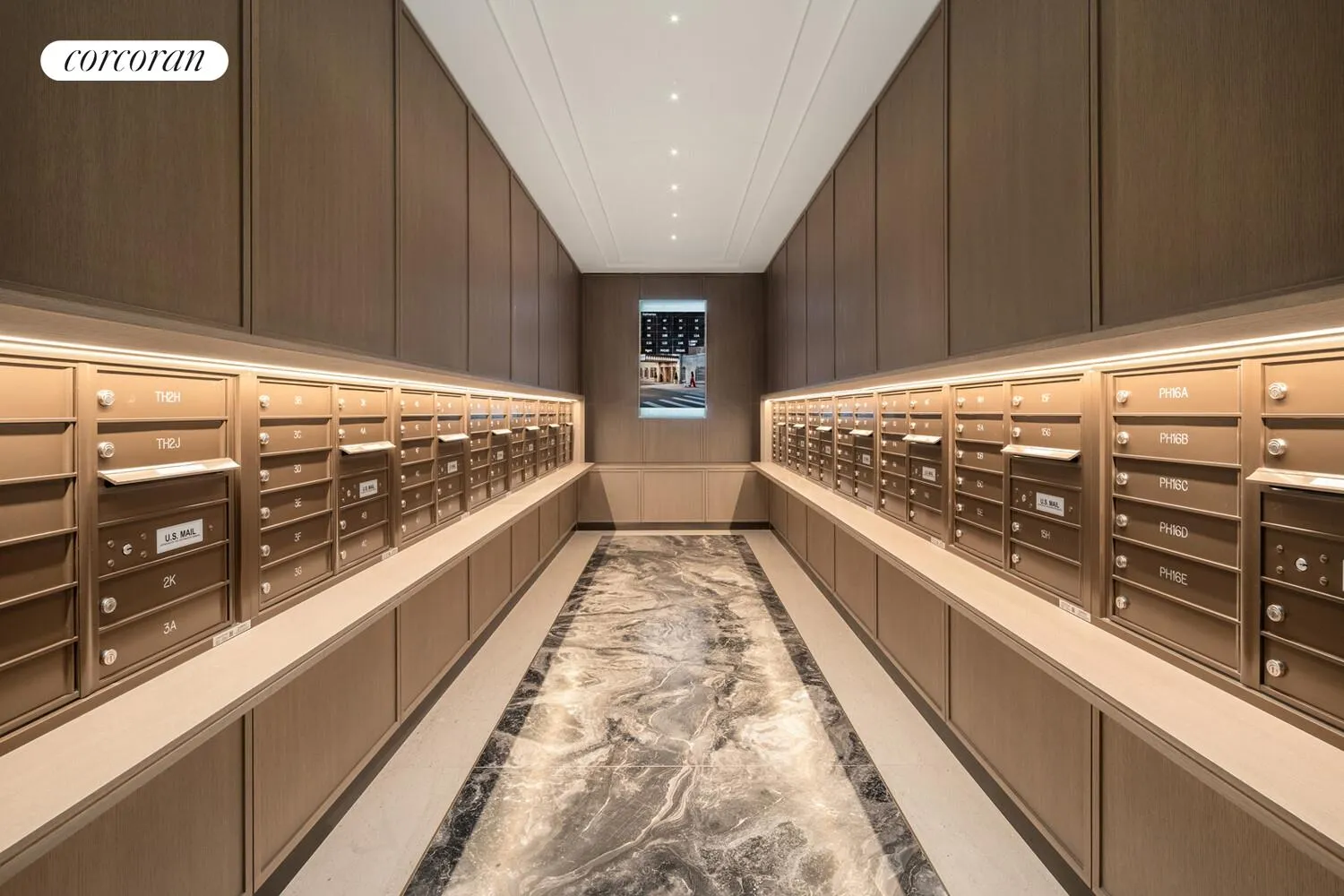 Residence 3C boasts a custom Italian kitchen by Boffi featuring a hand selected honed Namibia Rose marble countertop and backsplash, white oak cabinetry, fluted, reflective bronze upper doors and Waterworks polished chrome hardware. Professional-grade appliances include Sub-Zero refrigerator, Wolf cooktop and oven, Wolf speed oven, wine fridge, and Cove dishwasher. Professional-grade appliances include Sub-Zero refrigerator, Wolf cooktop and oven, U-line wine fridge, and Cove dishwasher. An oversized closet can be found in the primary bedroom. No expense has been spared.